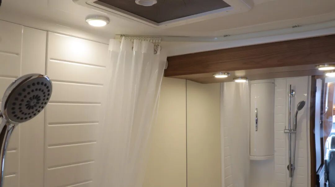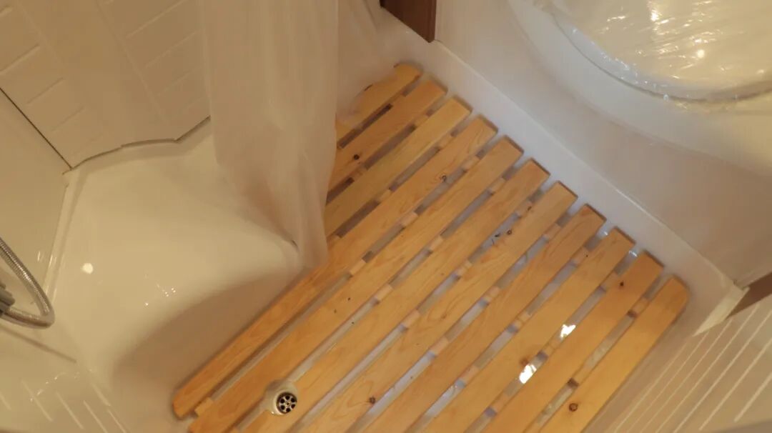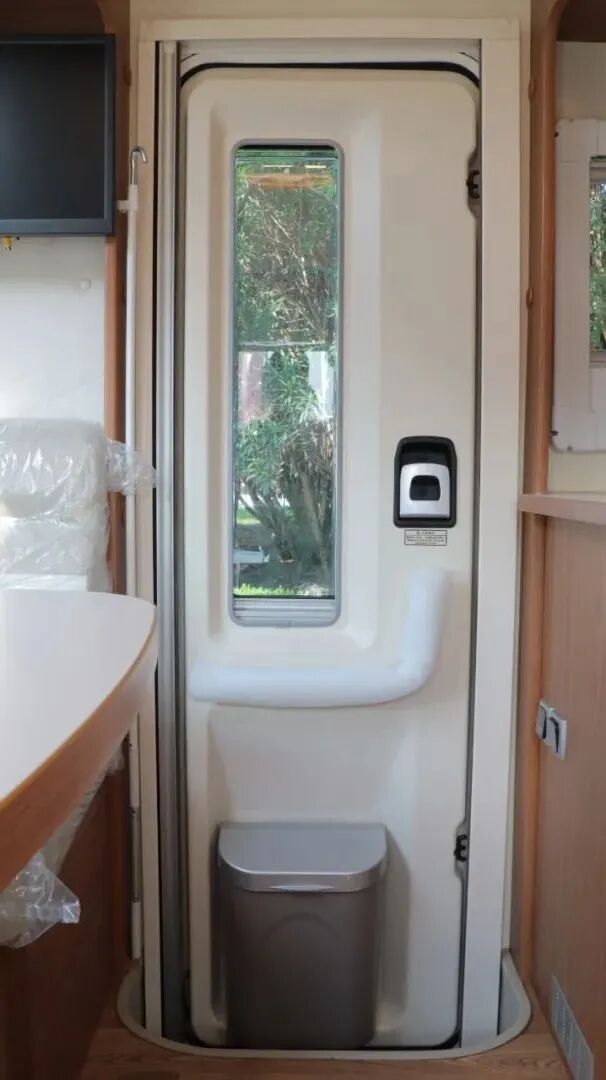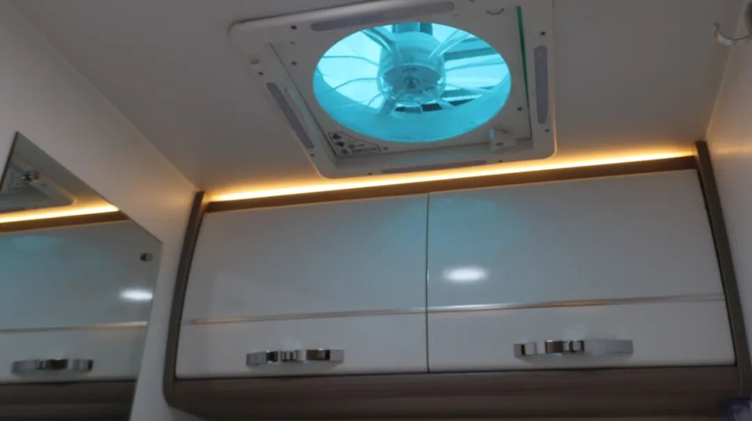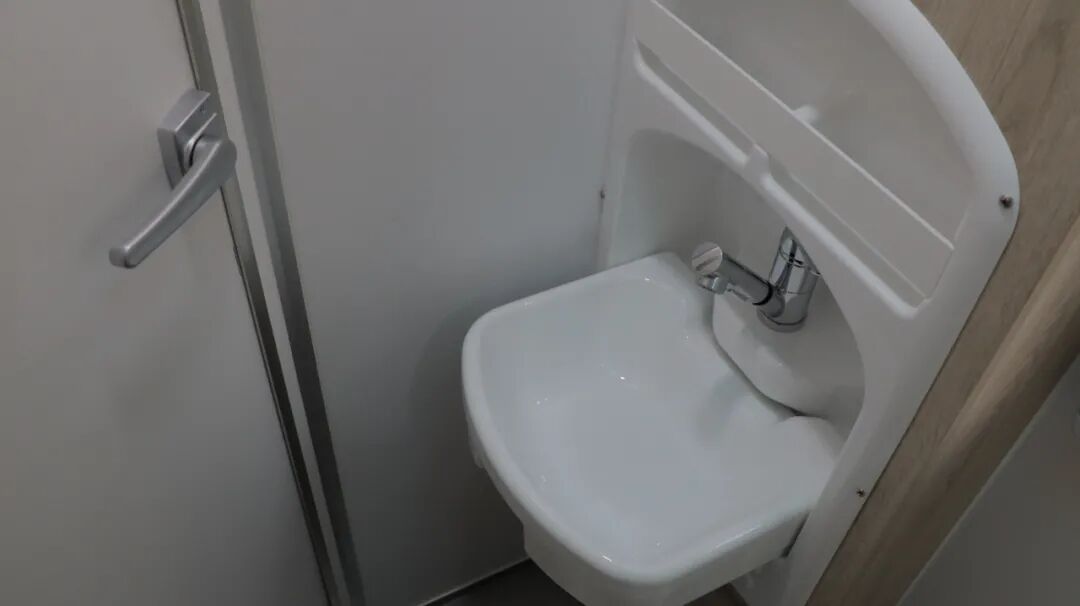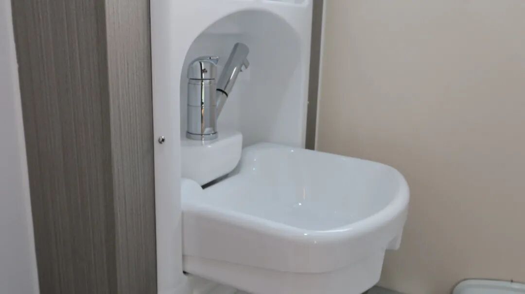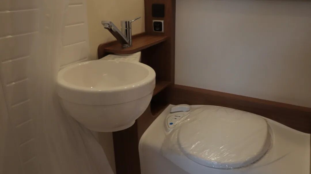 干湿分离卫生间,内置三乔房车盒式马桶、梳妆镜、吊柜、梳洗面盆等设施。