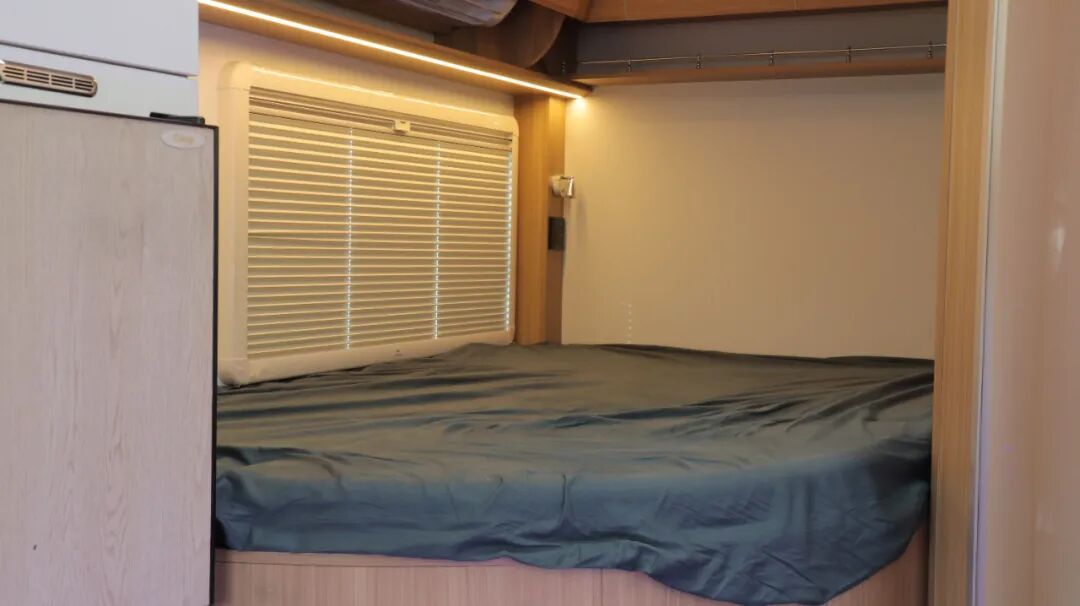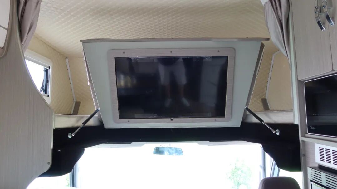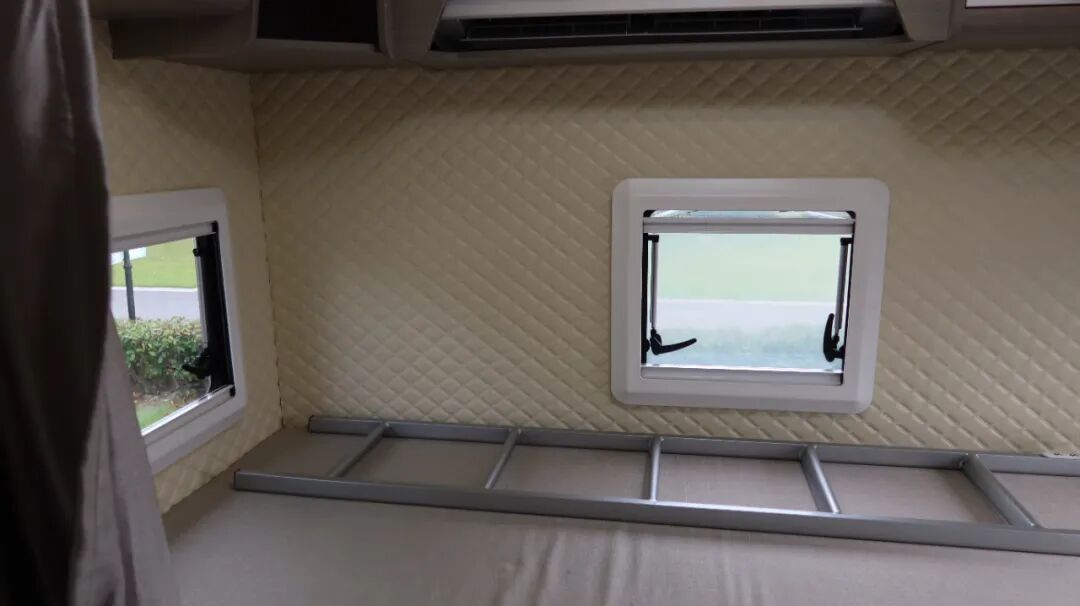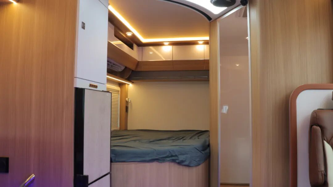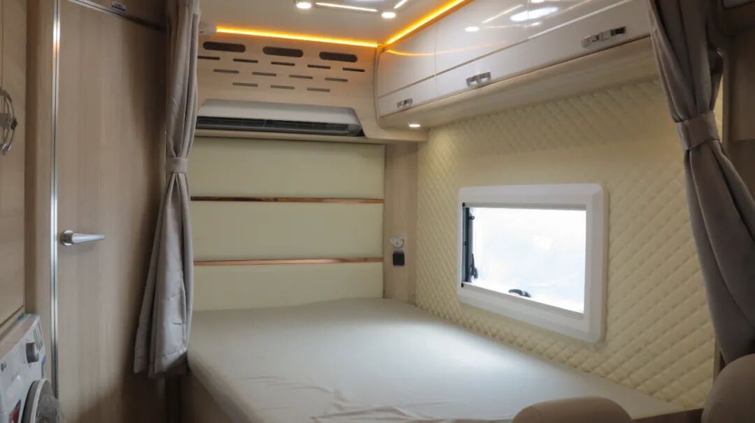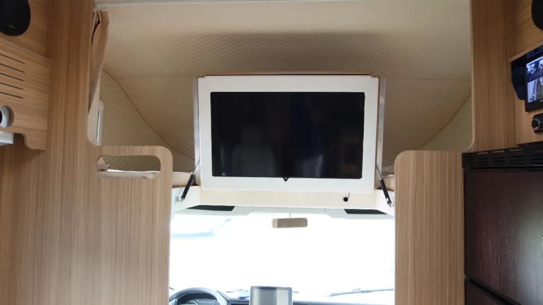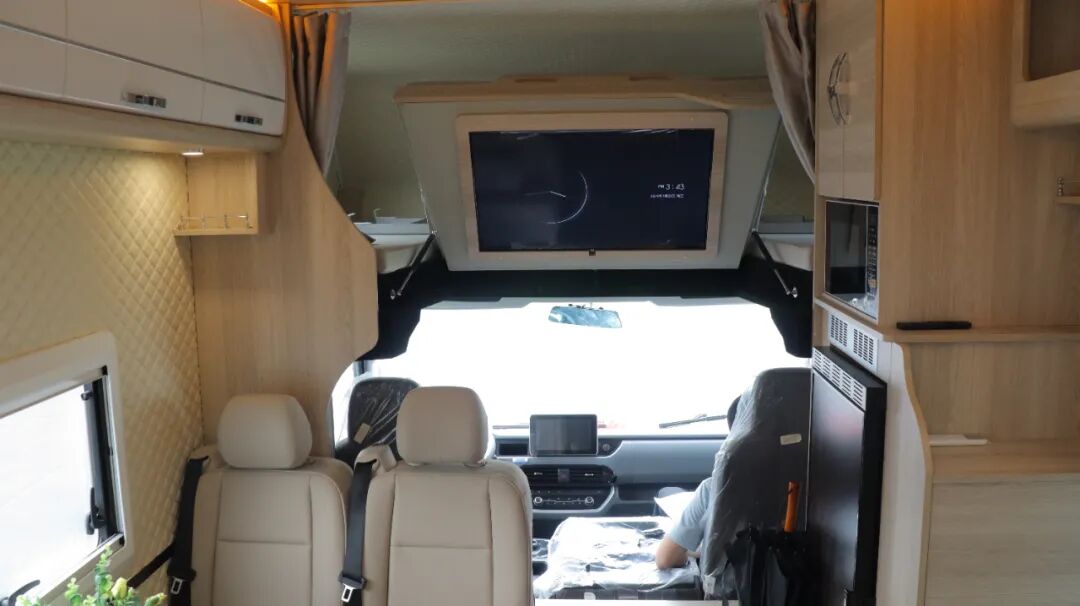 额头床为双人尺寸,空间宽裕。床下内嵌32寸网络电视,电视搭载KTV点歌系统,丰富车内娱乐生活。