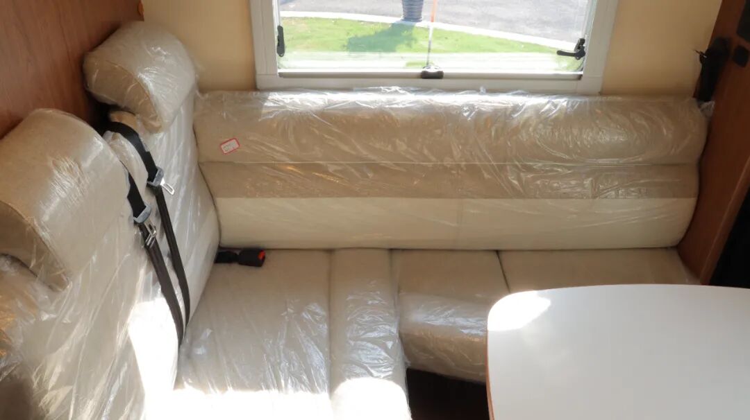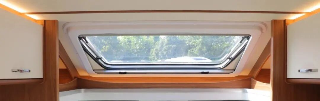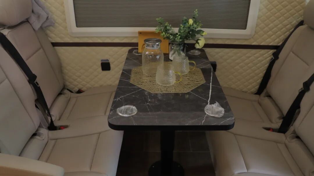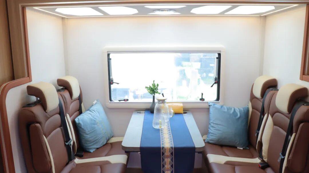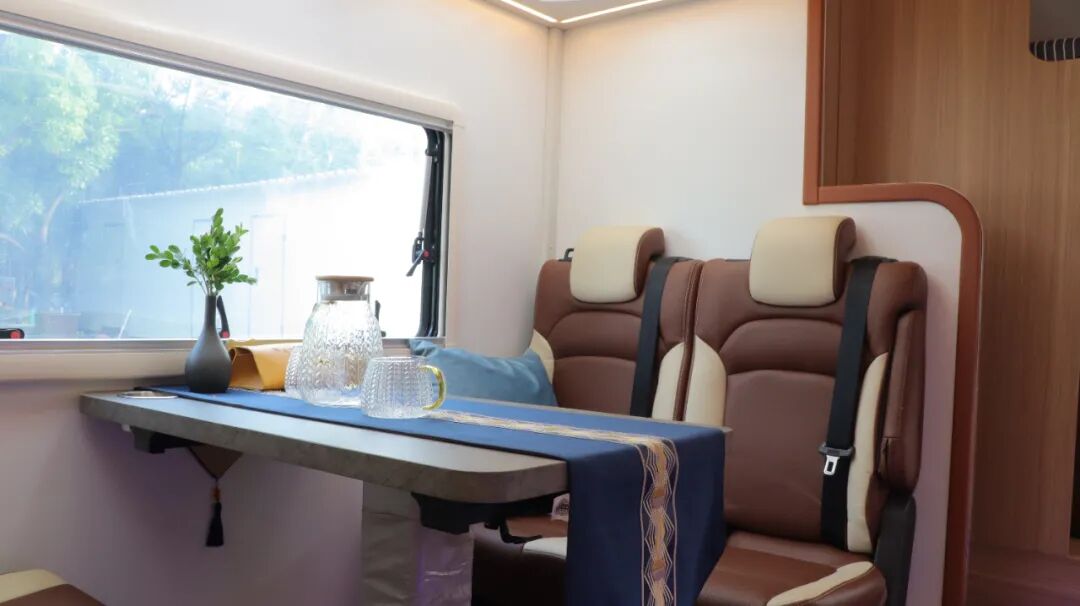 会客区采用双人座椅+可折叠餐桌,客厅可开启天窗。