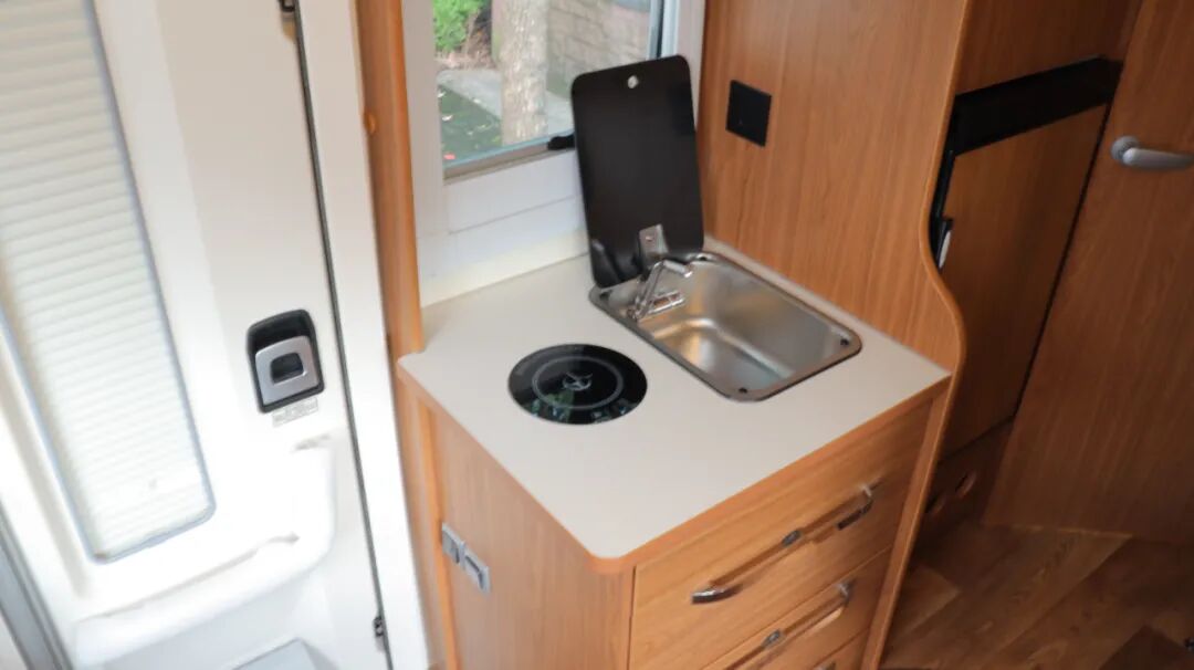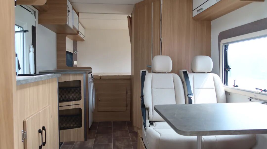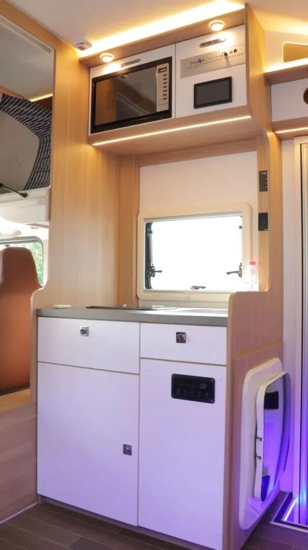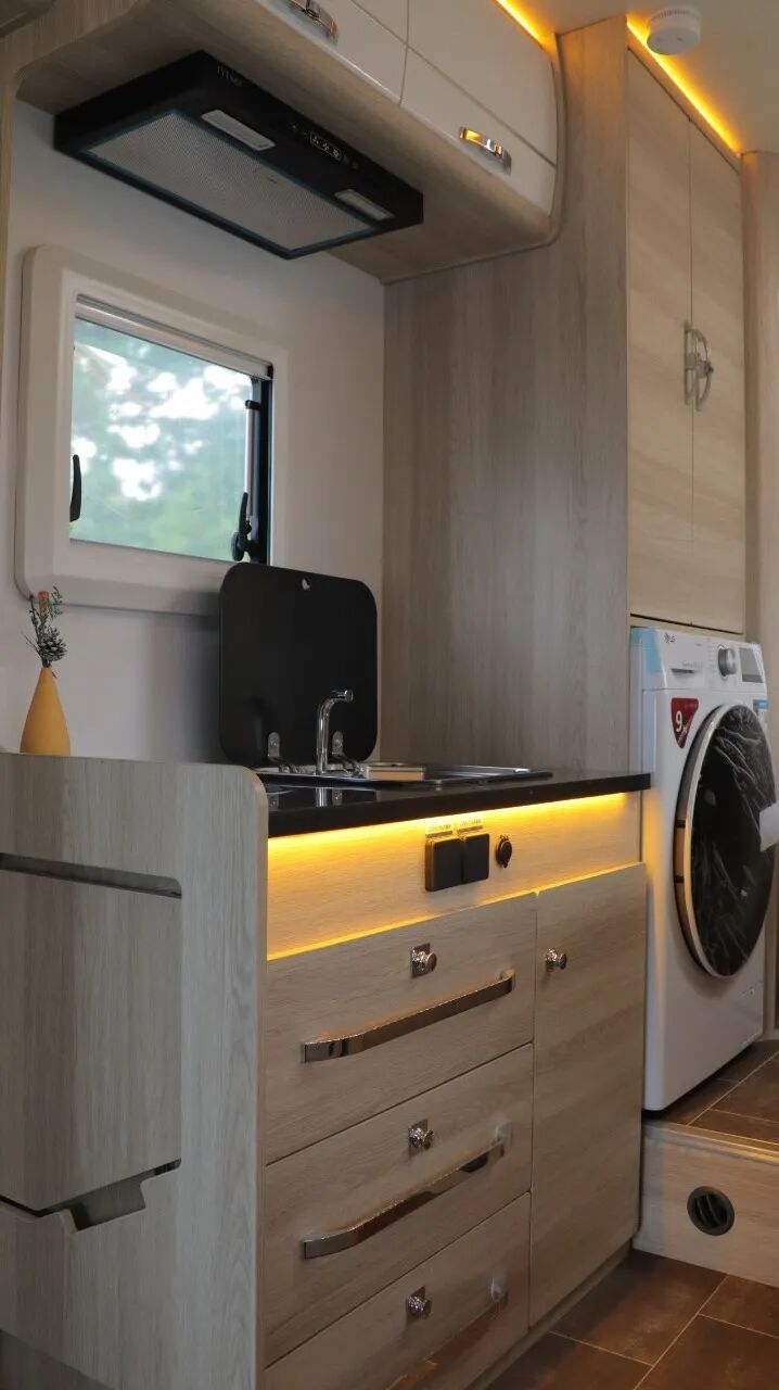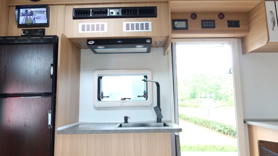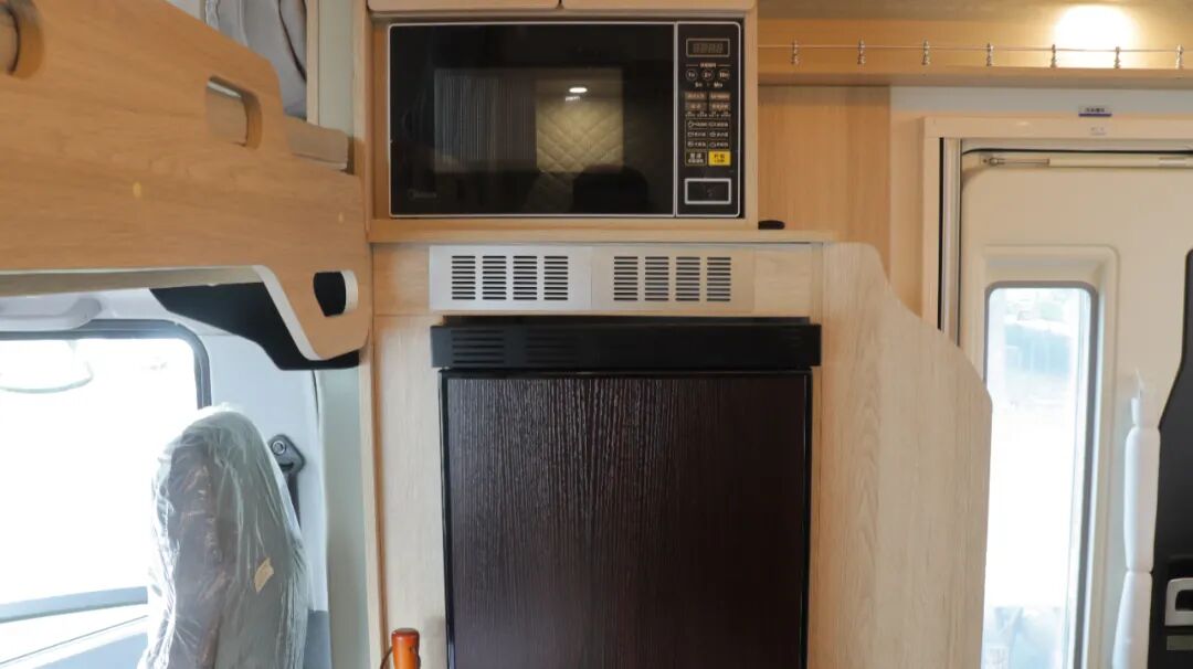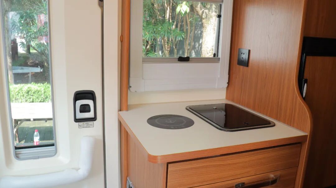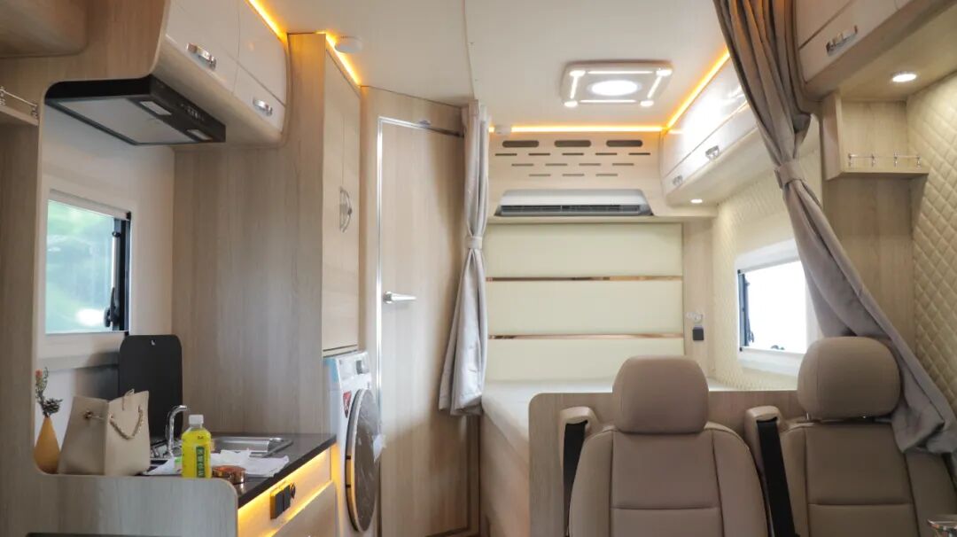 一体式厨房配置带盖板不锈钢水槽、电磁炉、吸油烟机、微波炉、133L冰箱、房车专用滚筒洗衣机和橱柜等。