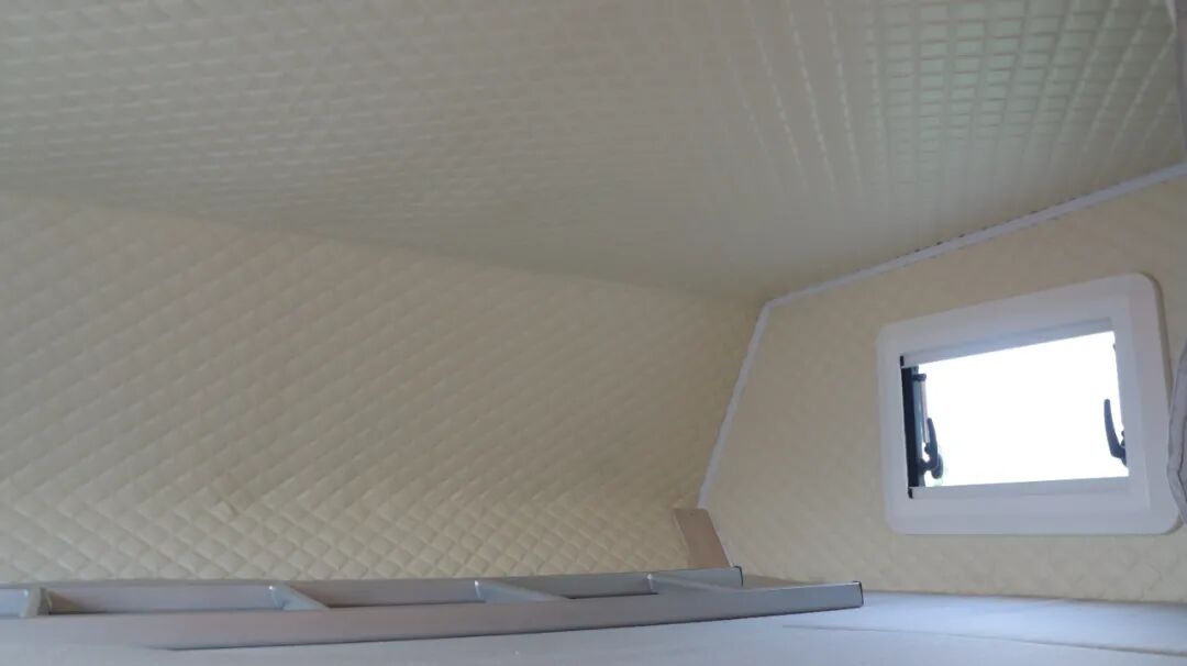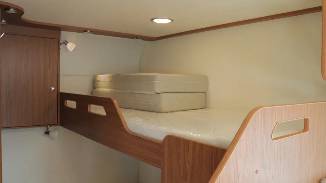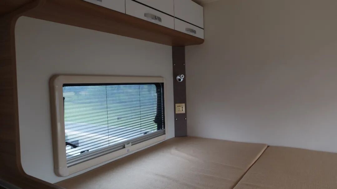 车内后部采用纵置子母床设计,上铺为单人床,下床为双人床。
