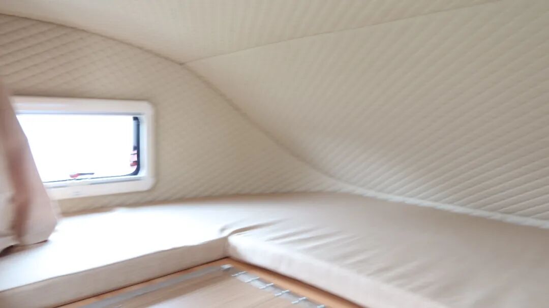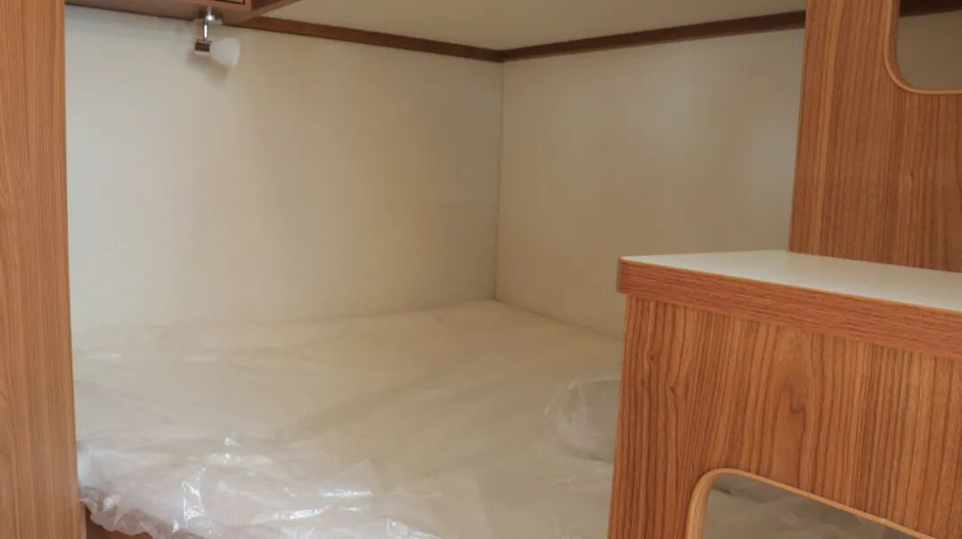 尾部横床为双人床尺寸为2100*1350mm,周围同样采用软包处理,三面环窗,还有隐私帘。