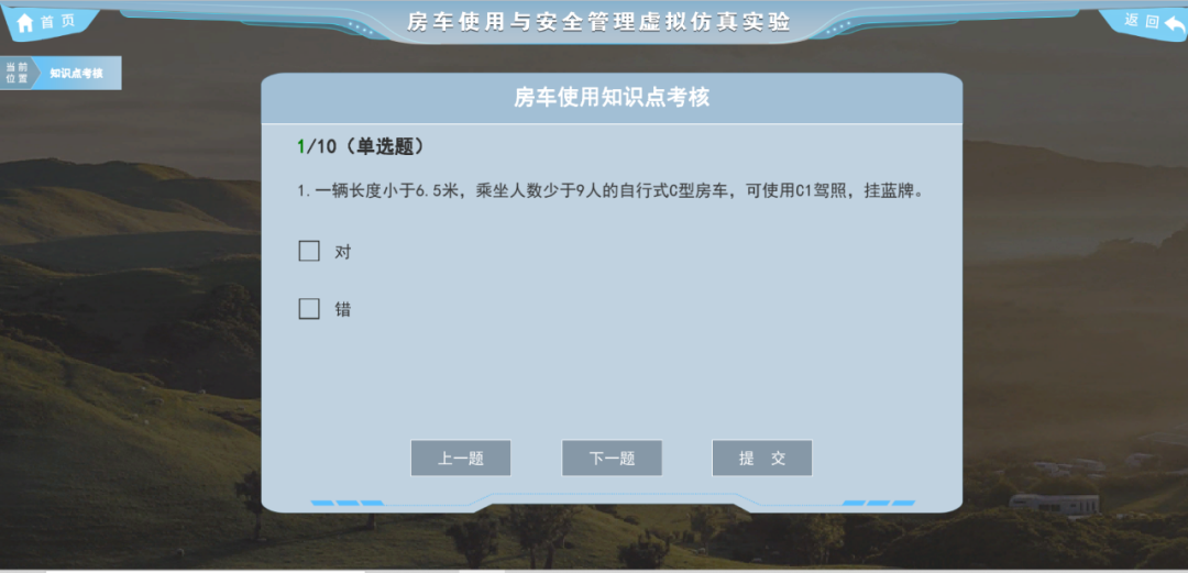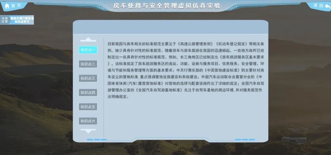 该模块分为知识点学习、知识点考核两部分,可进行房车相关知识的学习与考核。