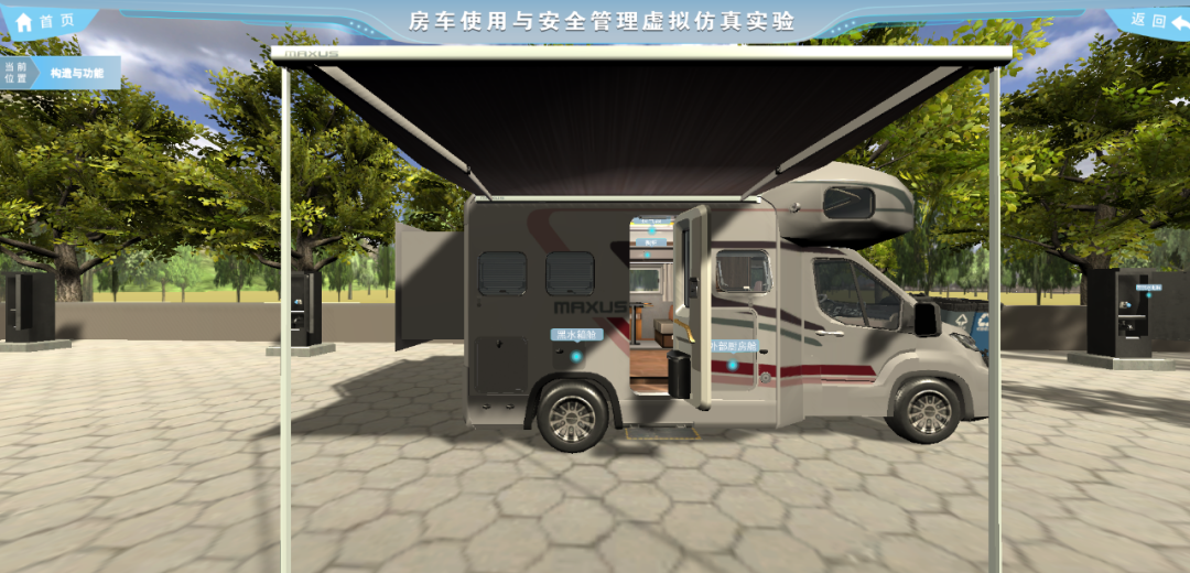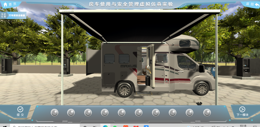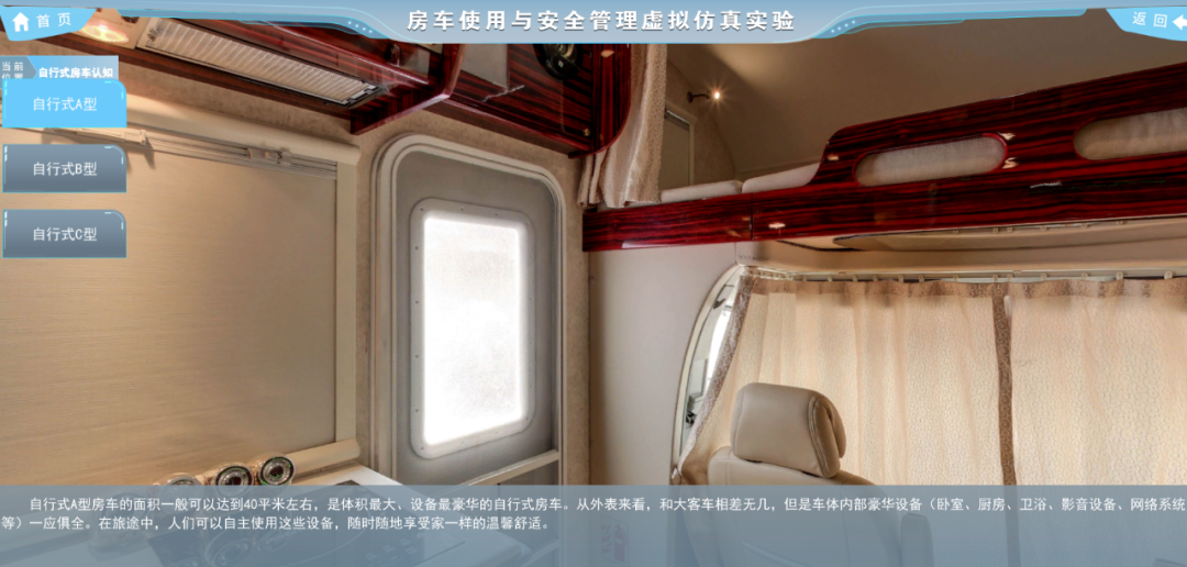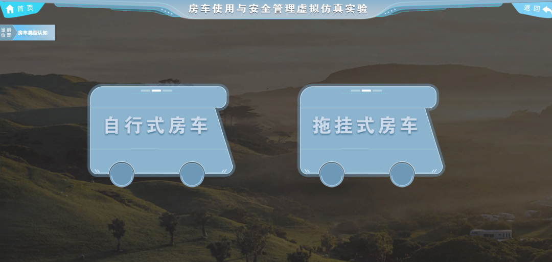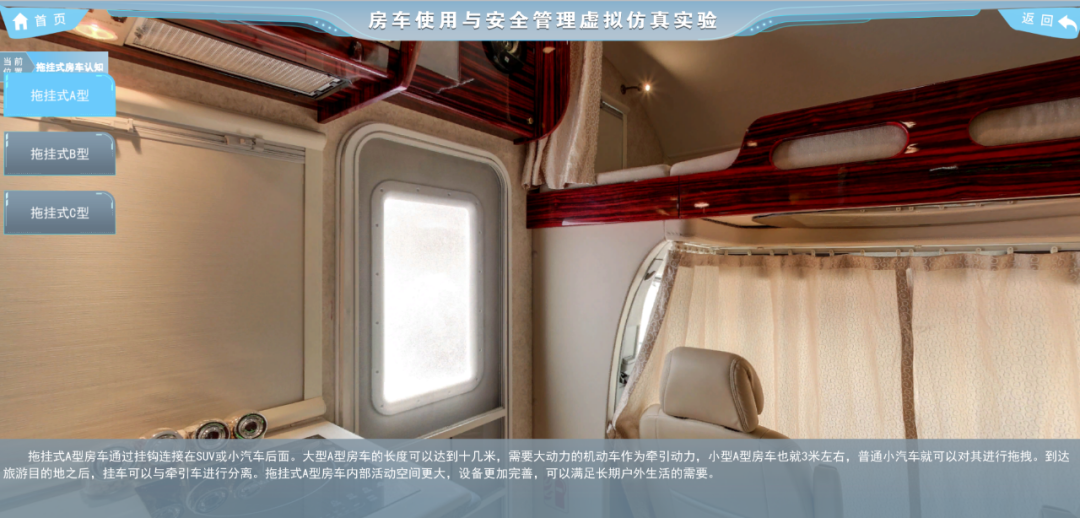 进入此实验模块后可点击自行式房车、拖挂式房车查看相应的房车类型介绍(有全景图的会进入全景图查看)。