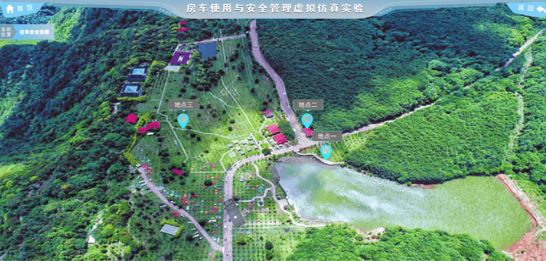 停车场使用:点击该模块之后会出现一个有三个停车点位可供选择,用户需要选择其中一个场景(场景图及停车点位以 UI 形式实现,可拉近拉远视角);选择某个点位后,如果是正确点位则房车会开动到用户选择点位处的一个动画,若选择点位不合适,则会出现 UI 提示,告知不合适原因。