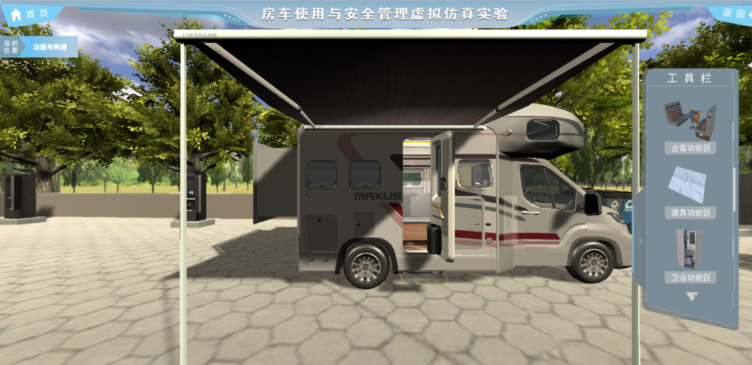 由上海师范大学旅游学院旅游管理教研室主任袁丁带领团队开发的“房车使用与安全管理虚拟仿真实验”通过虚拟仿真技术,可以在安全的情况下模拟自行式C型房车的使用功能,让乘客在家通过电脑就可以学习和熟悉房车上的各部分功能的使用方法和流程。
