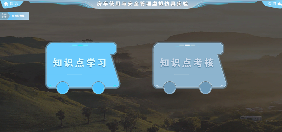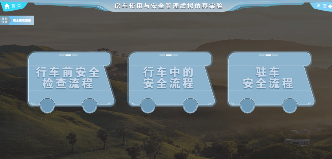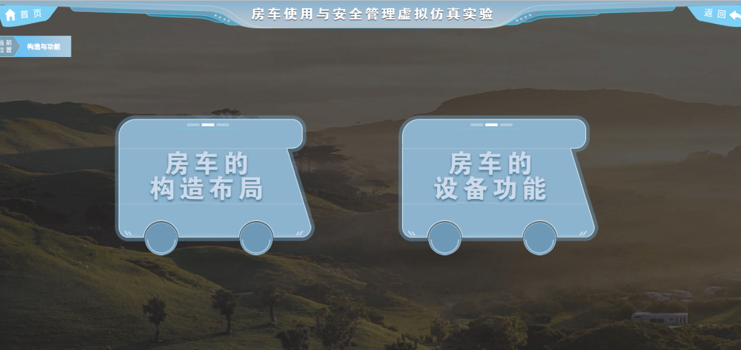 主界面虚拟仿真实验 UI 面板如下:用户可通过鼠标点击其中任意一个模块跳转至对应场景完成对应的功能操作,正常操作流程为:房车的类型认知—>房车的构造布局与设备功能—>房车使用安全流程—>本章知识点学习与考核。