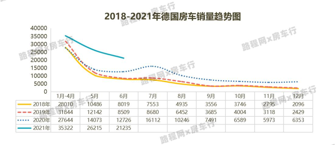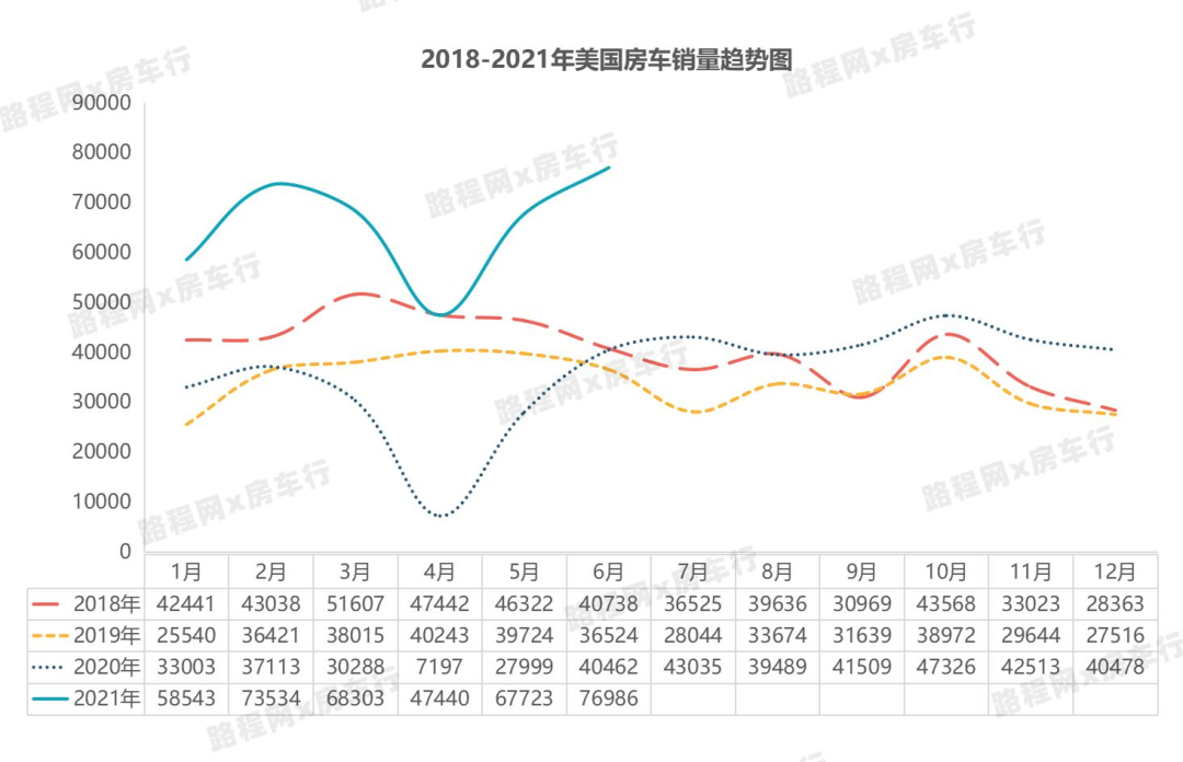 从日前路程网x房车行在酷车国际文化节暨北京房车购车周期间举办的“房车线上线下新零售研讨会”上发布的信息来看。据美国工业协会(RVIA)数据统计显示,2021上半年,美国房车销量为300267辆,与去年上半年相比增长了70.5%,2021全年预测将在56-58万之间。而德国房车工业协会(CIVD)则是给出了2021全年房车销量有望首次达到12万辆的预测。