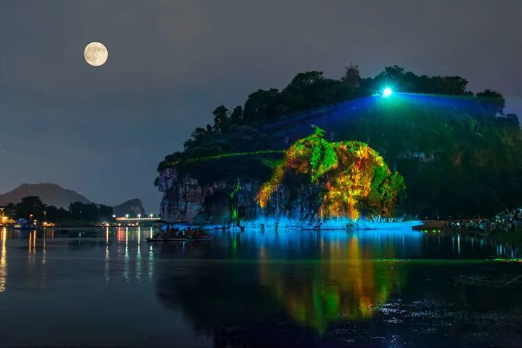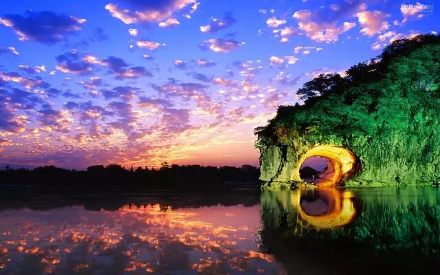 坐落西岸的象山水月与漓江东岸的穿月岩相对,一挂于天,一浮于水,形成“漓江双月”的奇特景观。