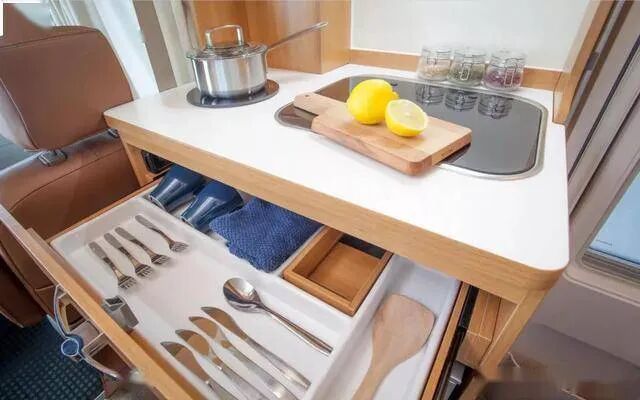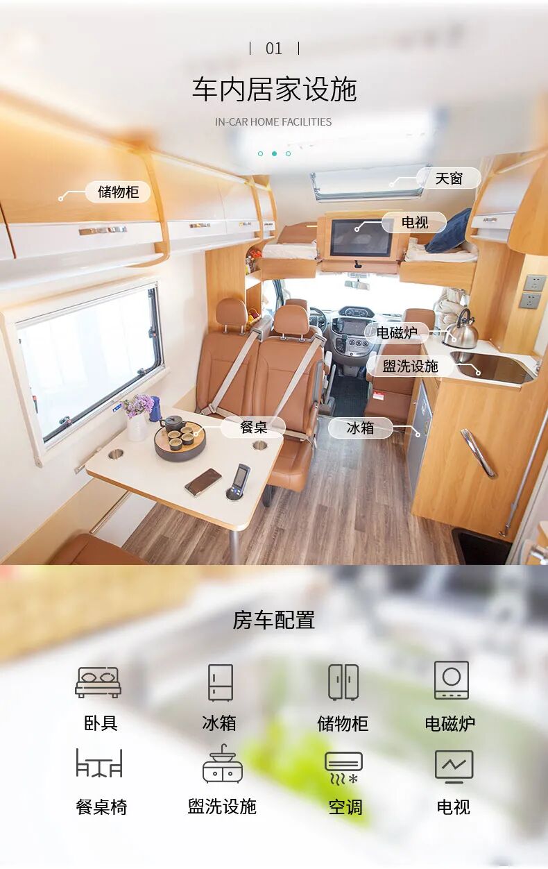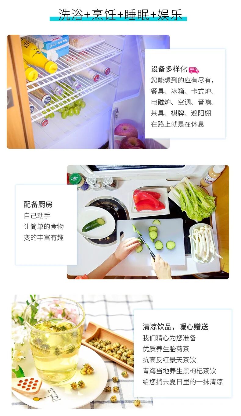 2、房车配备:大床厨房淋浴间、冰箱电视遮阳棚、电磁炉卡式炉、餐具茶棋牌、一次性拖鞋、洗手液,应有尽有,这是一座移动的城堡。