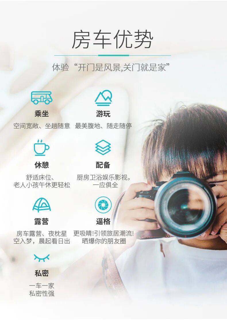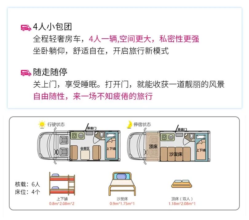 1、房车空间:全程房车出行,4人一辆,私密性更强,超大空间,可独立出发。出行舒适,自由任性,适合全家出游,行车途中随意切换休息模式。