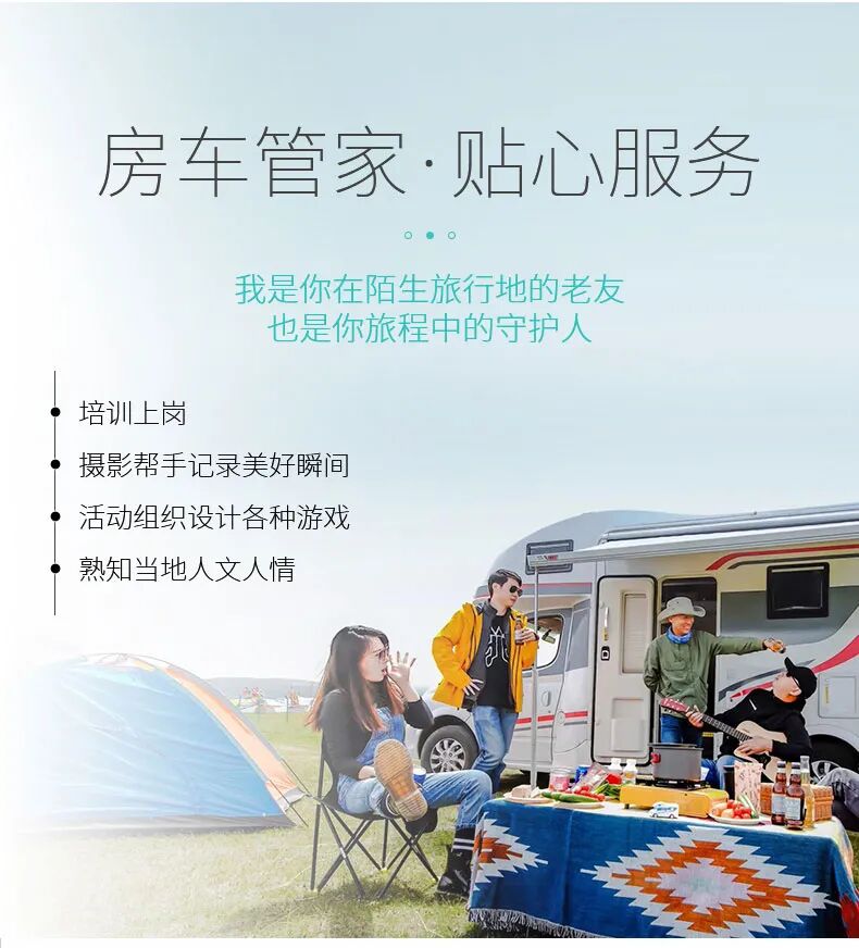 3、房车管家:全程房车管家贴心服务、培训上岗,保证出行安全。他们认真负责,风趣幽默,了解当地的风土人情,负责您车辆消毒、房车驾驶、人文讲解、摄影帮手、活动组织一站式服务,为您排忧解难,做您的贴心小棉袄。