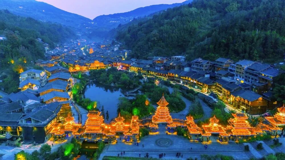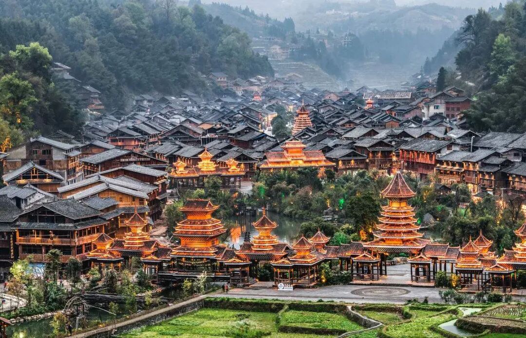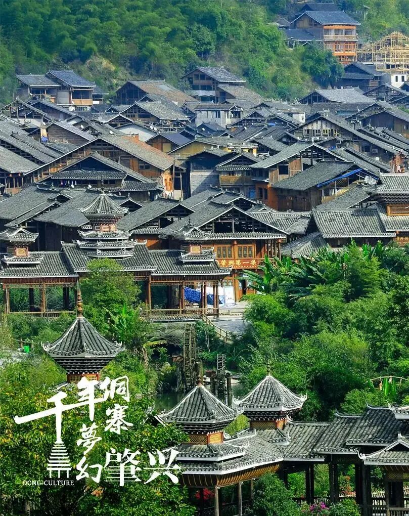 肇兴侗寨,位于贵州省黔东南州黎平县,是黔东南侗族地区最大的侗族村寨。也是侗族的民俗文化中心。到2012年,居民1100余户,6000多人。肇兴侗寨四面环山,寨子建于山中盆地,两条小溪汇成一条小河穿寨而过。寨中房屋为干栏式吊脚楼,鳞次栉比,错落有致,全部用杉木建造,硬山顶覆小青瓦,古朴实用。肇兴侗寨分内姓外姓,对外全为陆姓侗族,分为五大房族,分居五个自然片区,当地称之为"团"。分为仁团、义团、礼团、智团、信团五团。