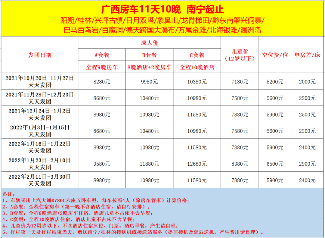 (A套餐:全程9晚房车(第一晚自理);B套餐:8晚酒店+2晚房车露营(龙脊梯田+巴马长寿乡);C套餐:全程10晚酒店)