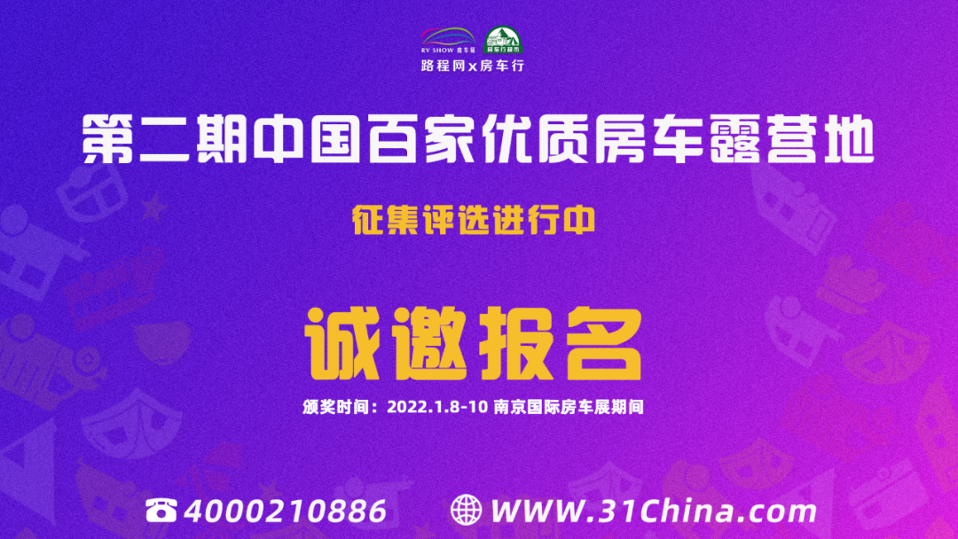 同时,首届及本届评选入选企业,也将受邀参加2022年1月8-10日南京国际房车展同期举办的“中国百家优质房车露营地”颁奖盛典。此外,入选企业营地信息也将被刊登于新版2022《中国汽车房车露营地地图》,全国发行推广。现将第二期“中国百家优质房车露营地征集”事项作以下通知: