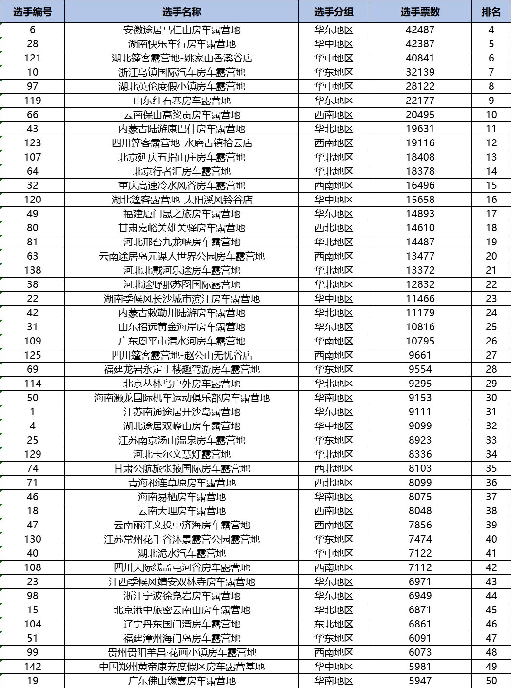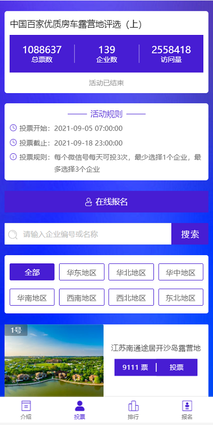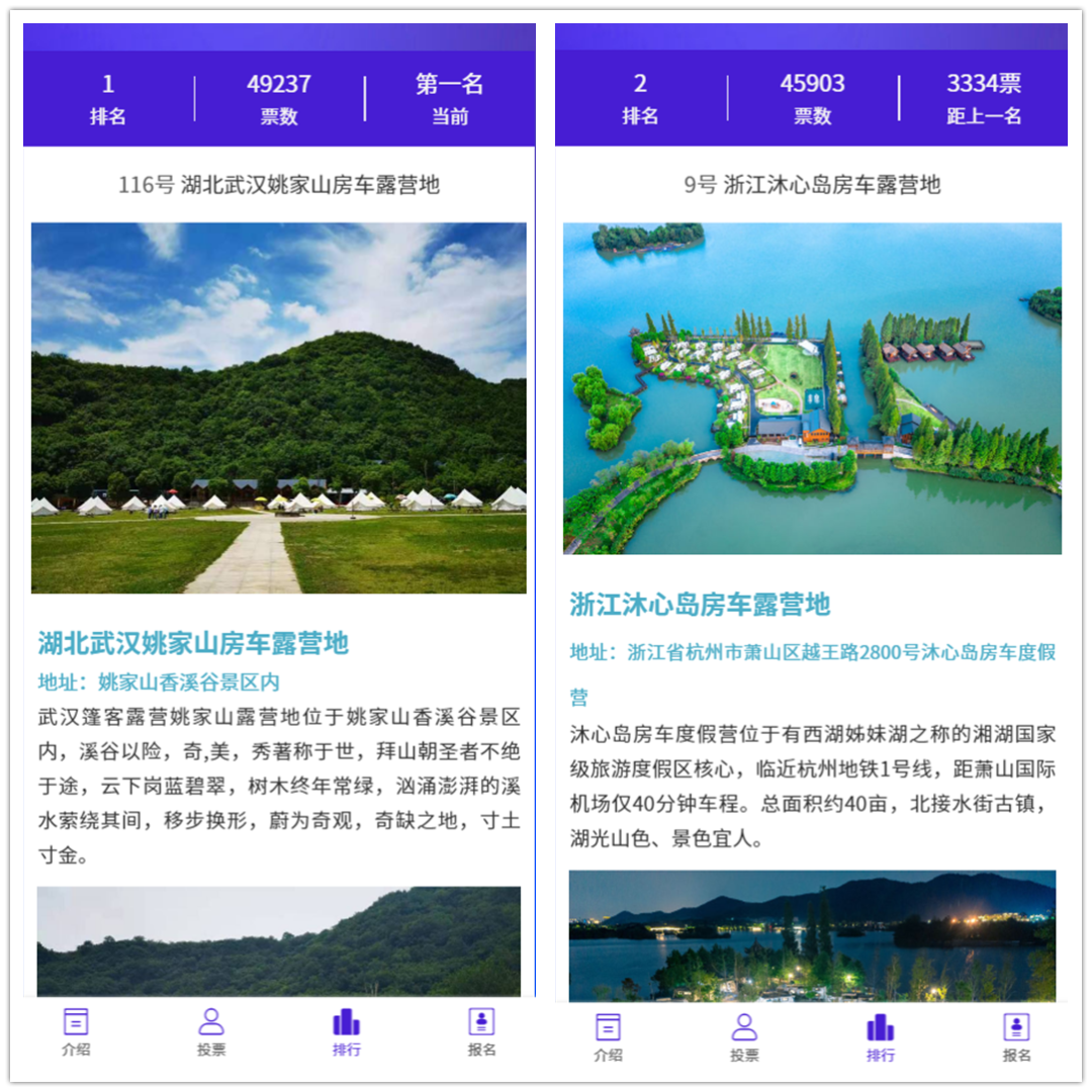 4、组委会将根据网络投票名次,征集房车露营行业协会的推荐意见,邀请行业专家及领导综合评审出50家营地企业,并举行颁奖表彰。