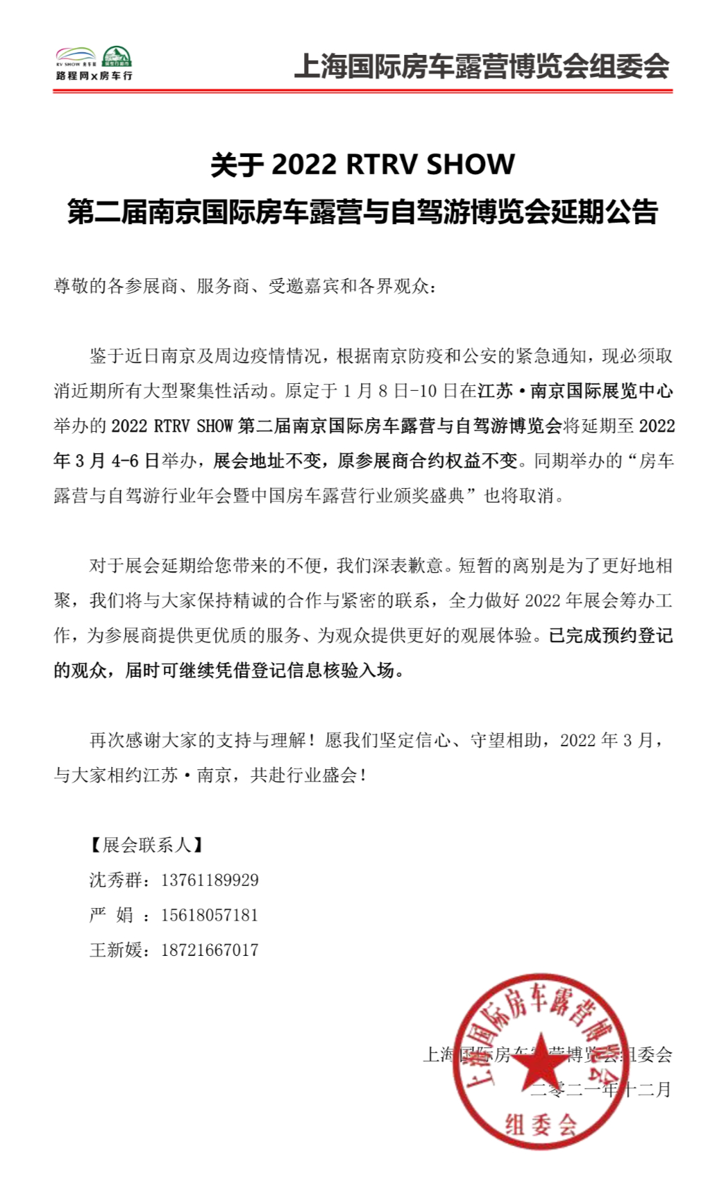 鉴于近日南京及周边疫情情况,根据南京防疫和公安的紧急通知,现必须取消近期所有大型聚集性活动。原定于1月8日-10日在江苏·南京国际展览中心举办的2022 RTRV SHOW第二届南京国际房车露营与自驾游博览会将延期至2022年3月4-6日举办,展会地址不变,原参展商合约权益不变。同期举办的“房车露营与自驾游行业年会暨中国房车露营行业颁奖盛典”也将取消。