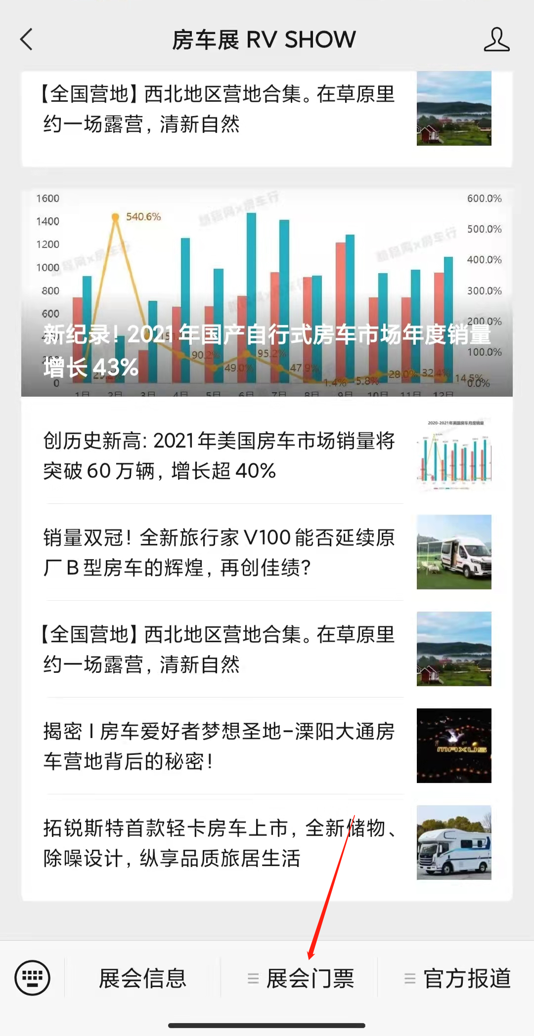 1、关注微信公众号“房车展RV SHOW”,点击“展会报名”,直接预约登记您的信息。
