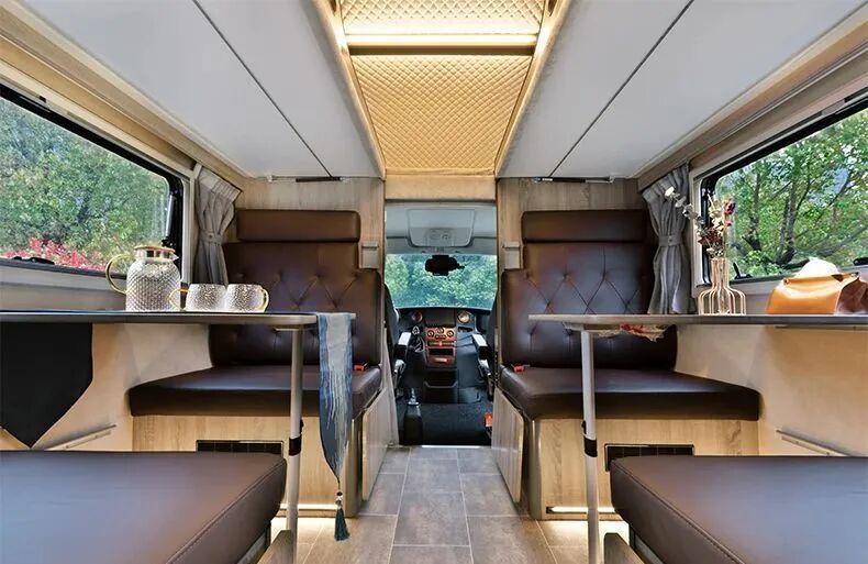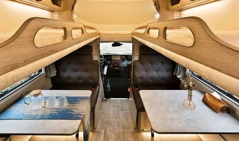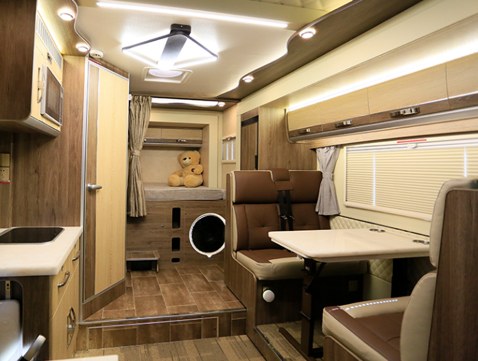 ● 休息区配备4张独立单人床+1张额头双人床,真正实现了6人6卧。对称上下铺可变卡座设计使其成为该系列房车中可用空间最大的无拓展车型,同时两个上铺均可上翻,提升下铺睡眠空间;