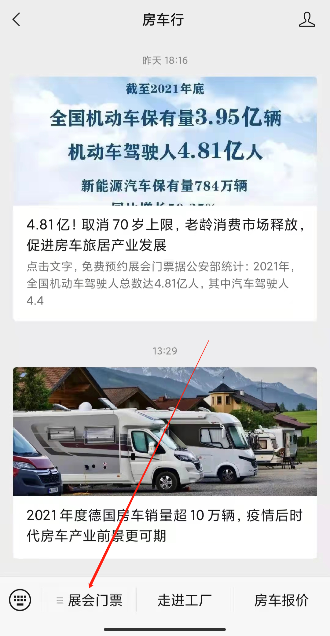 1、关注下方微信公众号“房车行”,点击“展会门票”,直接登记您的信息。
