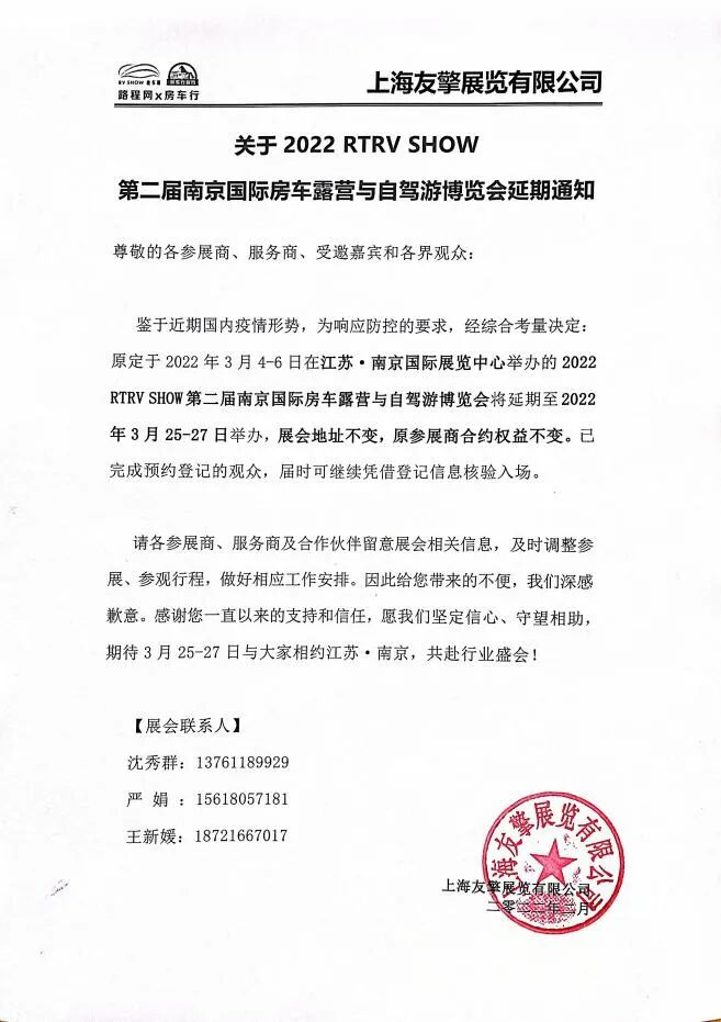 鉴于近期国内疫情形势,为响应防控的要求,经综合考量决定:原定于2022年3月4-6日在江苏-南京国际展览中心举办的2022 RTRV SHOW第二届南京国际房车露营与自驾游博览会将延期至2022 年3月25-27日举办,展会地址不变,原参展商合约权益不变。已完成预约登记的观众,届时可继续凭借登记信息核验入场。