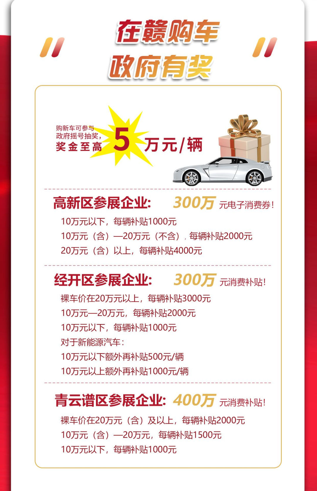 同时,由于活动恰逢疫情过后,政府有序复商复市之际,为响应政府促进消费政策,各大汽车销售企业还将携众多新款车型及经典畅销车型进行降价让利、赠送油卡、售后服务等购车组合优惠,另外,购车、参展还可参与政府购车抽奖、有机会获得电子消费券、消费补贴,具体奖励政策见下图: