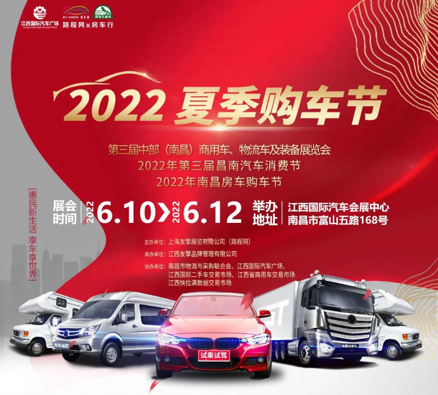 除众多经典、新款房车特惠特销以外,活动同期同地,第三届中部(南昌)商用车、物流车及装备展览会,2022第三届昌南汽车消费节也将正式启动。本次夏季购车季针对不同消费群体开展一系列与商用车、物流车、新能源车、二手车、汽车相关的促销活动,线上线下互动,以促进汽车消费为重点,发挥汽车厂家、销售企业、金融机构类汽车商家的优势资源,举行汽车产品展览展销活动,满足大众个性化、多样化、品质化的汽车消费需求,活跃汽车市场,推动2022年江西车市增长。