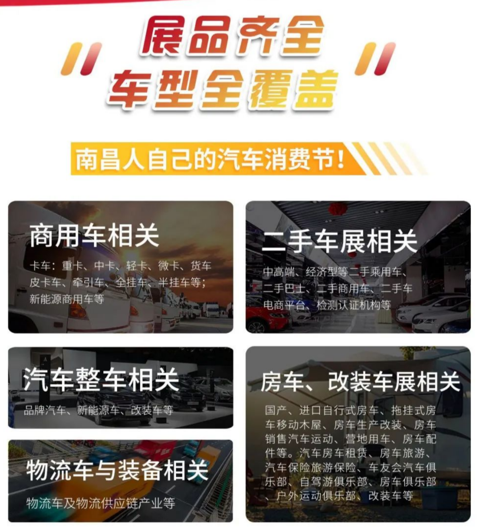 届时新车、二手车、乘用车、商用车、新能源车、物流车及相关装备均将在现场展出,车型全覆盖,品类丰富,应有尽有;无论你看车、选车的目的是什么,无论你是想用于旅行、商用、家用或是追求性价比,这里统统满足你!