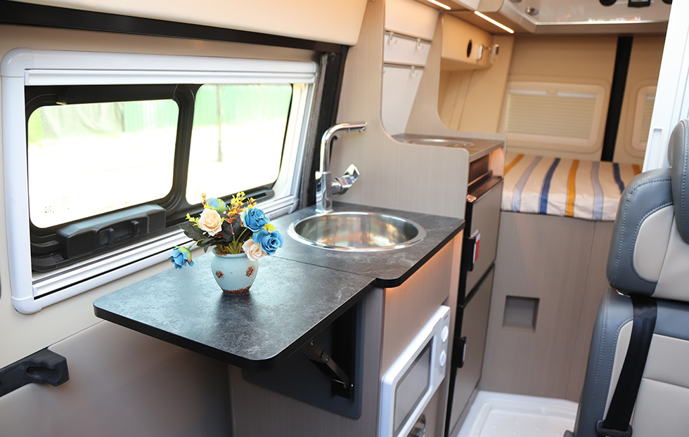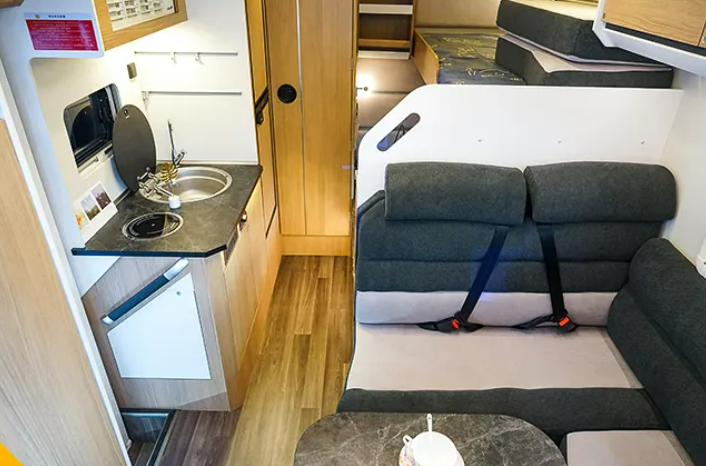 ● 生活区配置齐全,空间规划合理,从前往后设置了额头休息区、会客区、厨房区、卫浴区、尾部休息区,足以满足户外旅行需求;