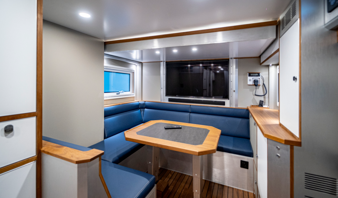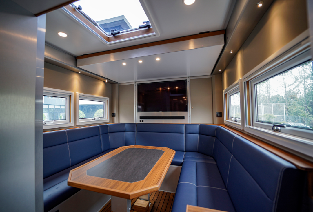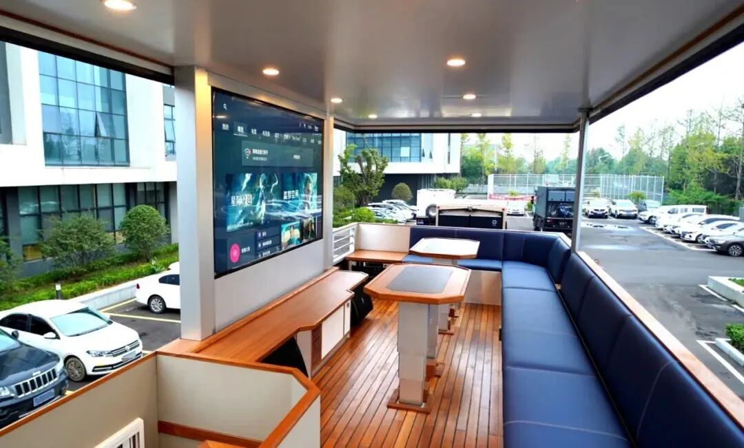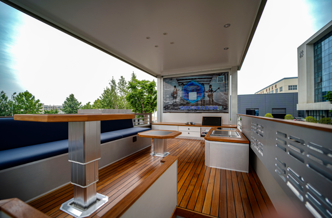 会客厅设置湖蓝色的U型环绕沙发雅致的配色,细腻的做工,严选真皮材质及乳胶填充,让沙发有了舒适的乘坐感;中间是一张柚木+岩板制成电动升降餐桌,宽大的沙发及餐桌,多人聚会也不显得拥挤;车顶设置宽敞的游艇飞桥露台,湖蓝色L型加长真皮乳胶沙发围绕露台的一侧,两张柚木电动升降桌椅立于沙发前。