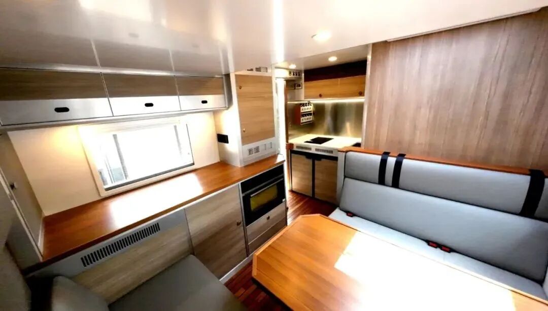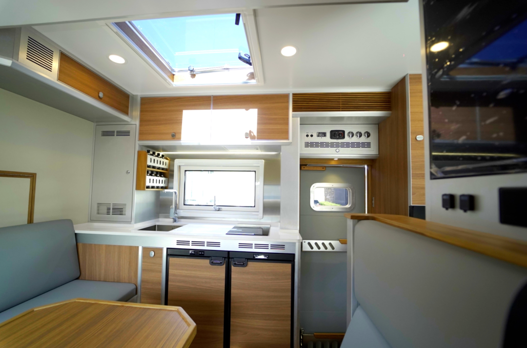 整车内饰采用浅色系配色,简约中透着奢华,车内柚木地板是植物油抛光,不会有恼人的异味和甲醛,保证健康;车厢前部是卡座沙发搭配电动升降餐桌的组合,只需轻轻一放,就可拥有一张1950×1200mm的双人床,在它的上方还有一张1900×950mm的升降床。