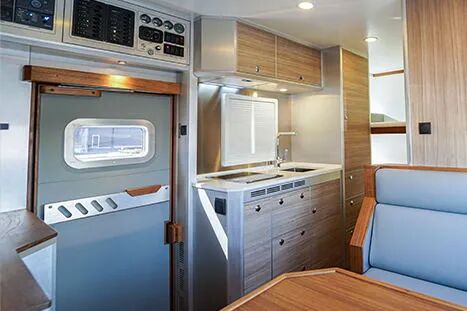 居住区域主要在生活舱的前部,真皮乳胶卡座式沙发和电动升降餐桌椅组成一张2X1.2m的双人床;另一张床就设计在这张床的上方,降下后即可使用,也是同等规格的大小。
