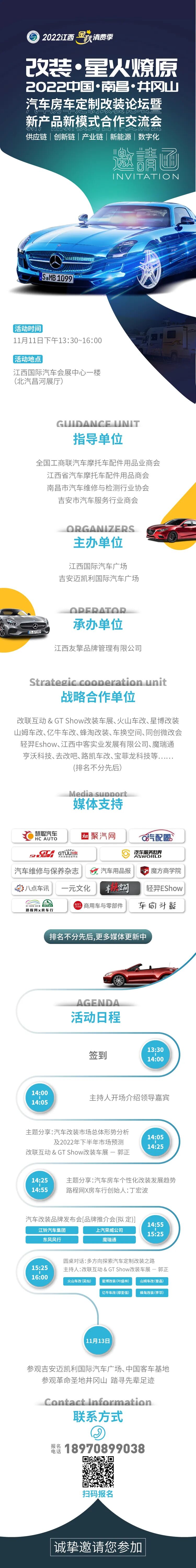 2022中国•南昌汽车文化节暨第三届中部(南昌)国际汽车后市场博览会同期活动改装•星火燎原2022中国•南昌•井冈山汽车房车定制改装论坛暨新产品新模式合作交流会将于11月11日下午在江西国际汽车会展中心一楼精彩呈现。本次论坛由江西国际汽车广场、吉安迈凯利国际汽车广场主办,上海友擎展览有限公司(路程网)协办,江西友擎品牌管理有限公司承办。