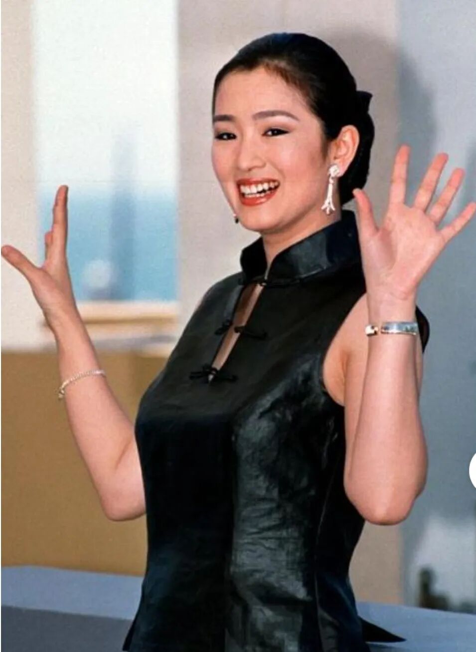 巩俐身穿黑色盘扣改良款旗袍上衣,这种内敛之美,让巩俐更添华光,让人一件难忘!