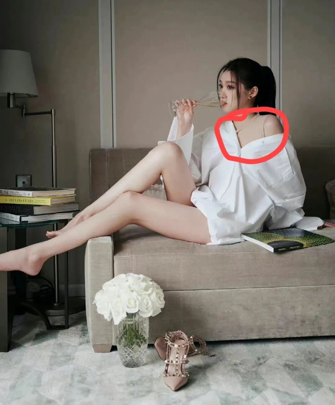 关晓彤举起香槟,微醺的眼神,性感妖娆的姿势,斜滑肩的穿法,美足和美腿交叠而置,这种性感让人怦然心动,这种整体视觉实在是会让人有莫名的冲动。