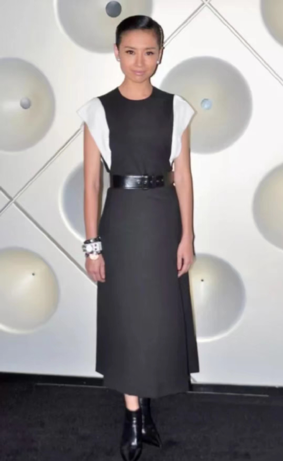 黑白拼色的赫本风长裙,高腰带的设计很妥帖,如果董洁肤色白皙,那么,这件单品会为她的美添彩,只可惜董洁选择单品时没有考虑自身条件。
