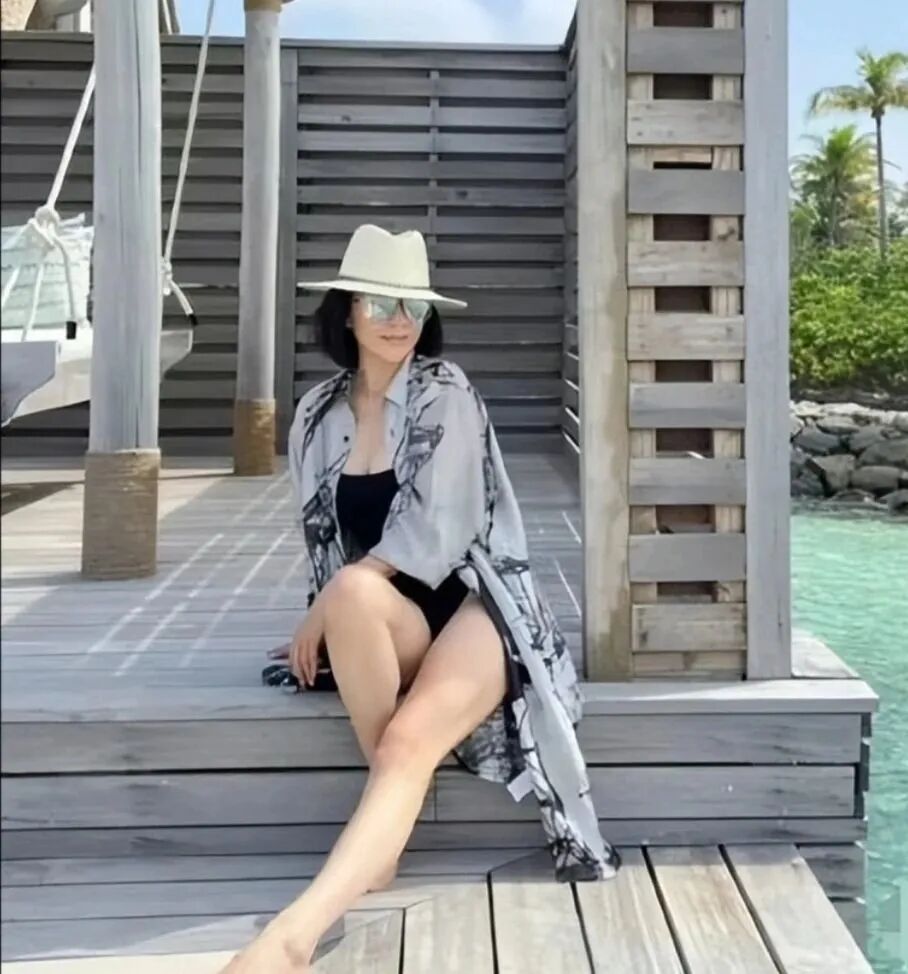 泳衣外面穿着这件防晒衣,看起来很有女人味,梁朝伟真有福气。