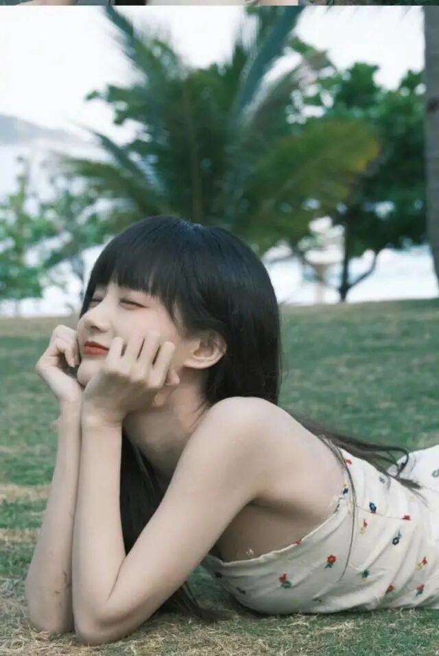 可见她俯身趴在草地上,双手撑着脸颊,一脸享受与快乐,秀色大露。