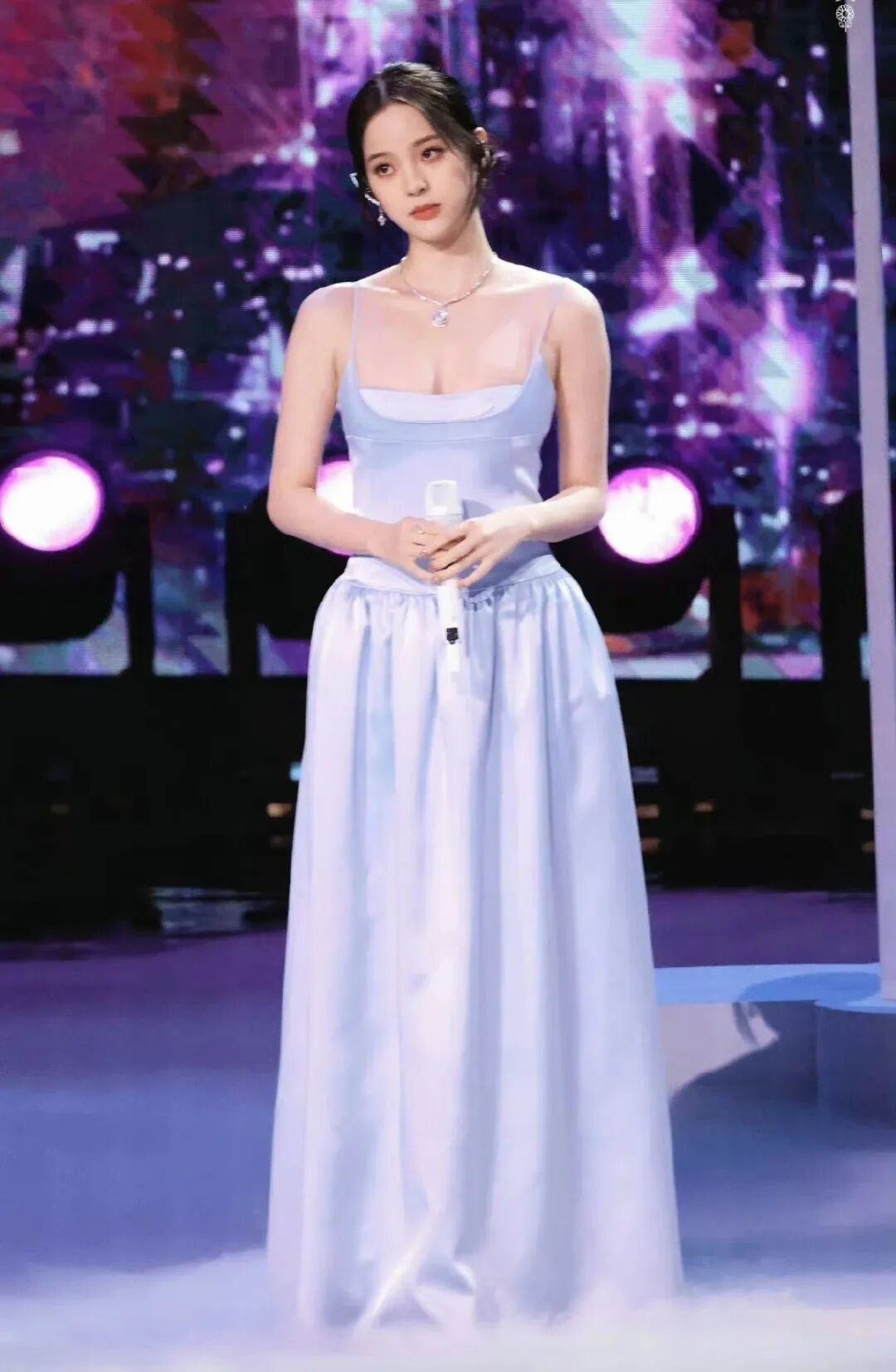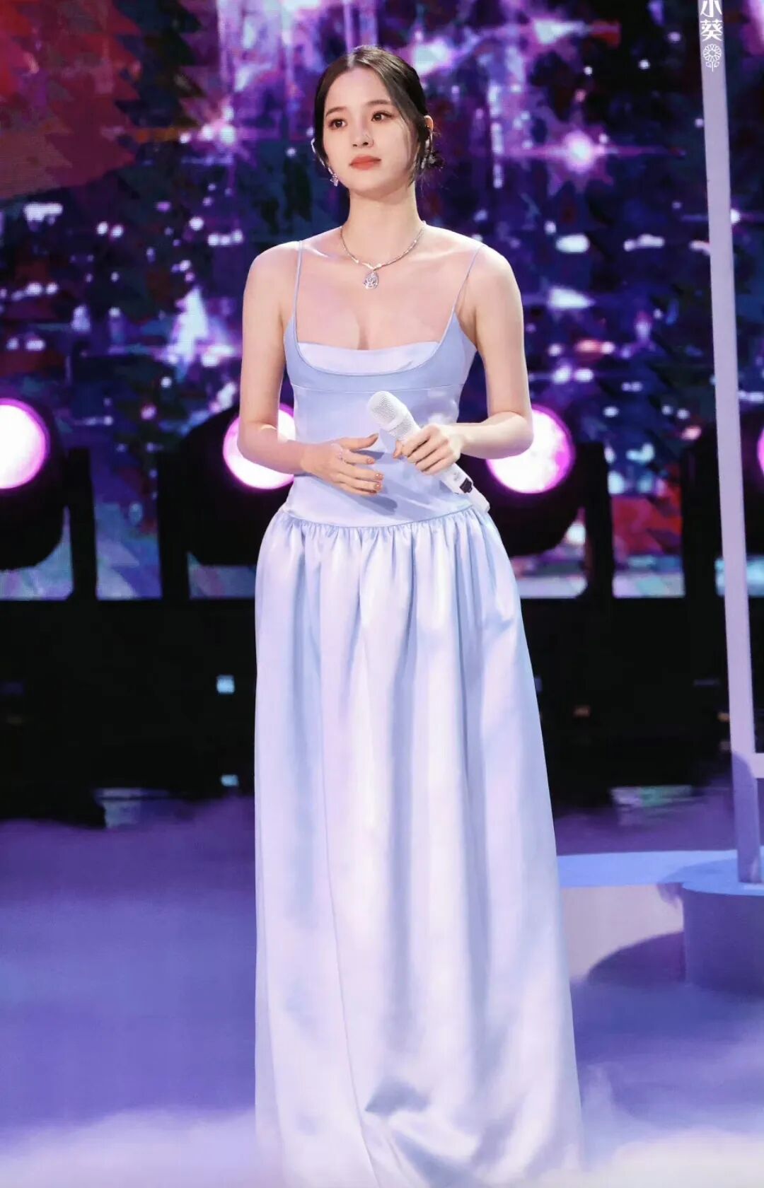 低胸的设计,对于才22岁的欧阳娜娜来说,确实或许性感了,不是那么的自然。所以在裙子的颜色上就花了点心思,选择了淡蓝色系,看起来更加的自然。
