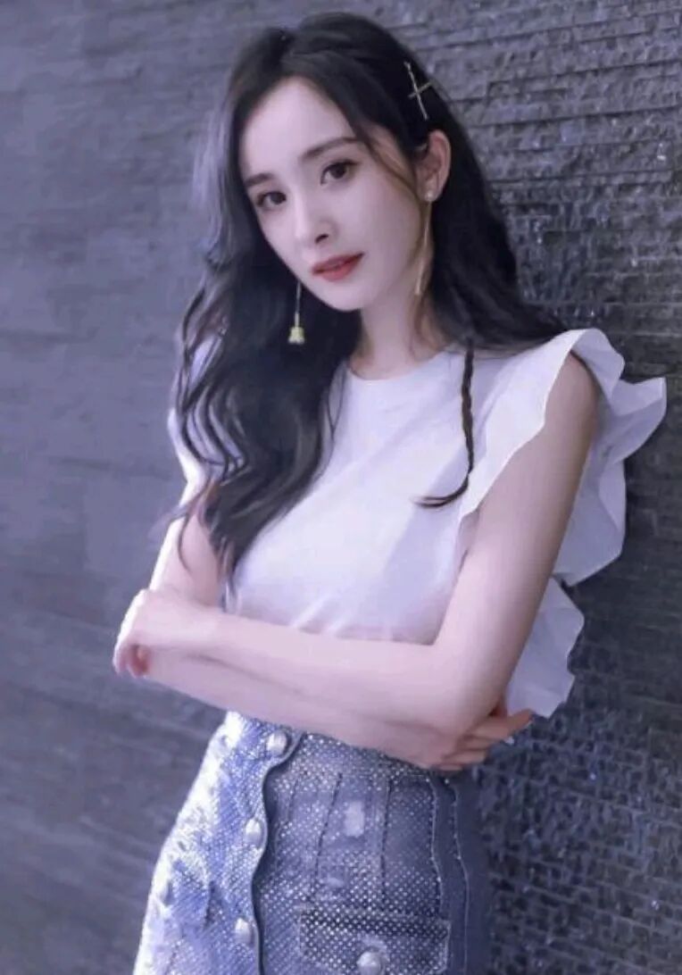 杨幂身穿荷叶袖公主白衫,下半身加持亮银色纽扣款西服裙,白和银色浑然一体,美丽且减龄。