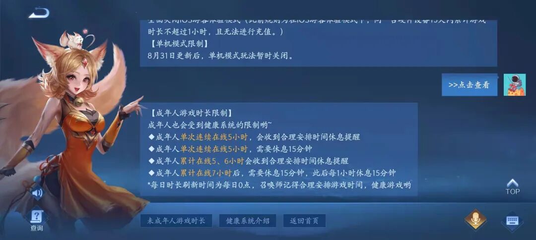 2已满18周岁的成年玩家在游戏中登录游戏时间过长,连续在线4小时,会休息15分钟。玩家累计在线7小时,会休息15分钟,此后每1小时休息15分钟,凌晨0点重置累计时长。