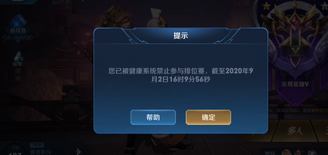 3玩家累计在线第5个小时开始,就会有提示7小时禁赛,这个从对局结束退到游戏界面会提示,第6个小时也会有提示,然后从第7个小时开始禁赛。