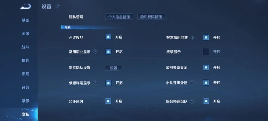 2、进入游戏设置功能后从上到下可以看到基础、图像、战斗、操作、布局、音效、录像和隐私功能,点击