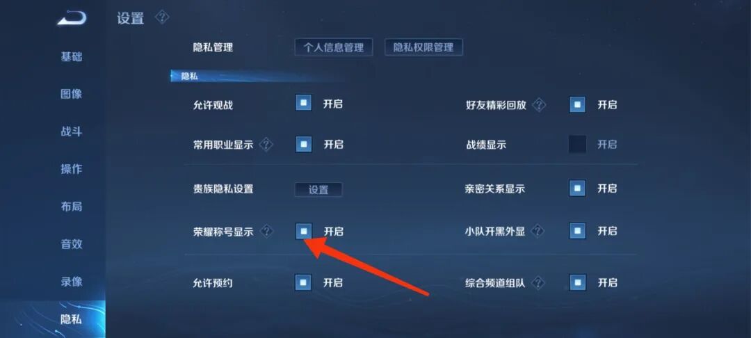 3、进入游戏隐私功能页面后,可以看到有一个荣耀称号显示的开关光标,点击光标使其关闭