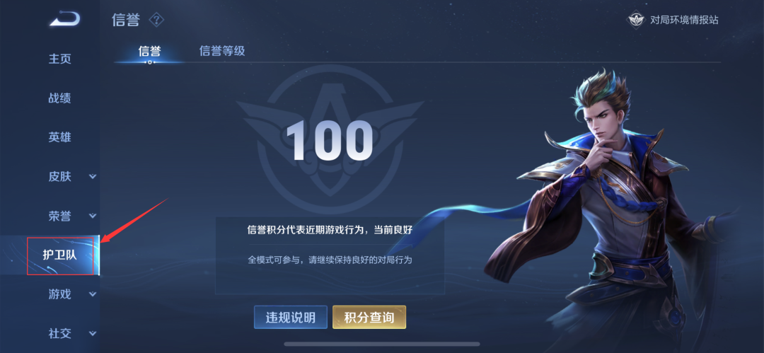 第三步左侧栏会出现一排选项,找到护卫队点击去就就可以看到自己当前信用分了。