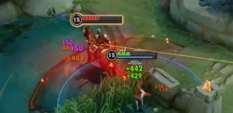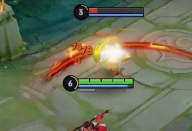 3:大招第一段是往前突进一段,然后再突进回来。第一次突进只有英雄附近圆形区域的目标会遭到击退,第二次也是。第二段是一个横扫,并且这个很少会留在地面一段时间,类似周瑜的火有一个持续伤害。这个横扫也可以攒被动。也就是说大招一个技能就可以攒两层被动。