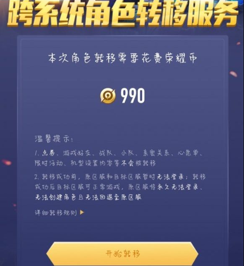 在王者营地选择第四个战绩频道,进入战绩频道之后点击你战绩上方的更多工具按钮。选择第四个战绩频道,进入战绩频道之后点击你战绩上方的更多工具按钮。点击进入开启跨系统角色转移服务,选择开始转移,转移角色需要花费990荣耀币,且转移之后想要再转移需要90天。