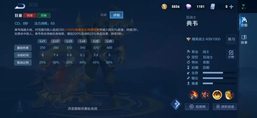 典韦的核心输出技能,在攻击到敌人之后能够增加自身的攻击速度,还能提供吸血效果,这个吸血效果是非常显著的,因此典韦能够极限反杀的例子非常多,靠的就是二技能还有一技能组合的瞬间爆发伤害。