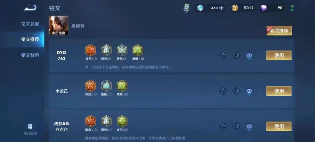 5.夏侯惇铭文搭配五:五个隐匿五个狩猎十个鹰眼八个异变二个无双这套铭文用于黄刀流夏侯惇,二技能护盾加一技能,就能轻轻松松秒掉对面的主c。在买一个不死鸟之眼,利用被动回血,即使残血夏侯惇,在团战时也能回血回的很快。出了黄刀你经济肯定不低,在清兵线发育同时,你肯定能carry全场。