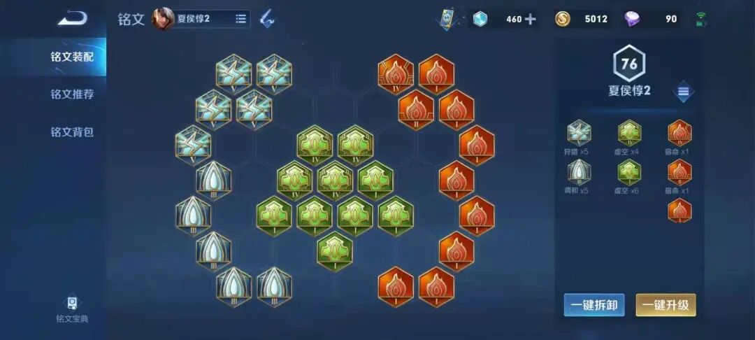 4.夏侯惇铭文搭配四:蓝色铭文,五个调和,四个隐匿,一个狩猎红色铭文,五个宿命,四个红月,一个异变绿色铭文,五个虚空,五个鹰眼。夏侯惇铭文这样出的原因是因为前期在不失坦克肉的情况下还可以爆发出极高的伤害。在前期就能爆发出很高的伤害,后期也就不成问题了。跟你们队的射手或法师这一类的输出英雄默契配合,能成功的带起节奏,就会赢得团战的胜利。